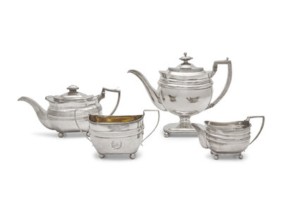 comprising a coffeepot by Thomas Richards, London, 1808, marked; a teapot, possibly by Solomon Hougham, London, 1806, marked; a covered sugar dish with gilt-washed interior, maker's mark rubbed, London, 1811, engraved with monogram, "K", flanked by laurel branches, marked; and a creamer, maker's marks rubbed, London, 1811, marked.
