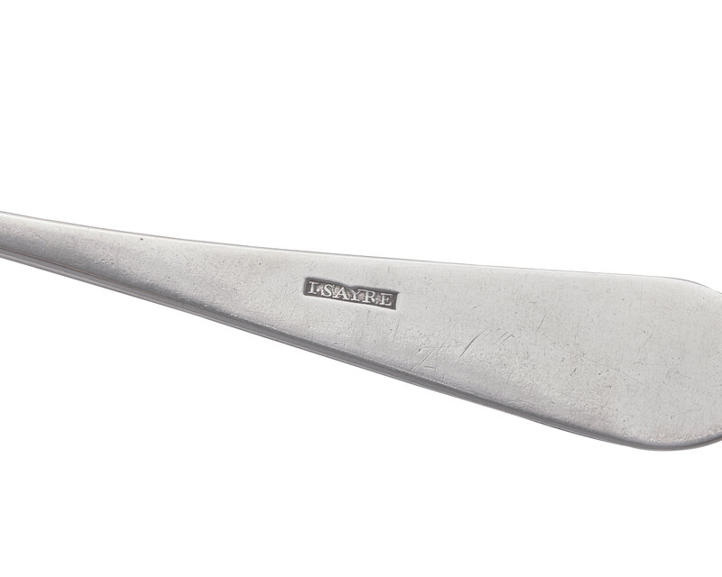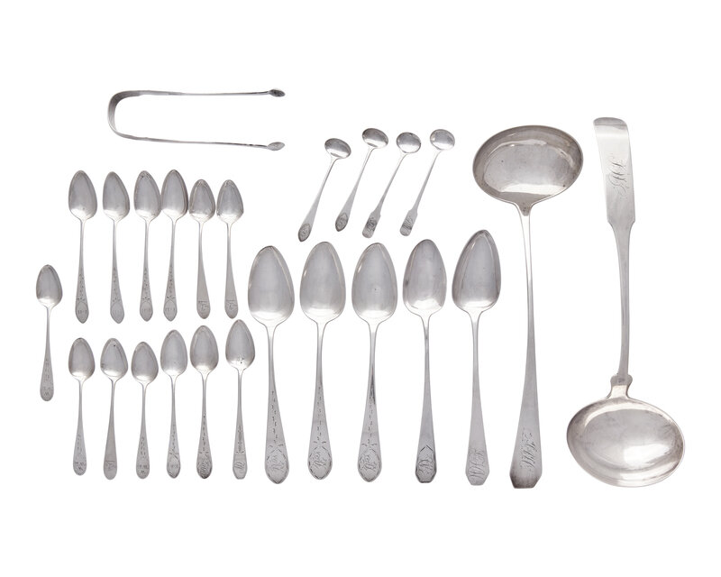 comprising fourteen items by John Sayre: a set of three tablespoons bearing monogram, "AT", a single tablespoon bearing monogram, "CV", a set of three teaspoons bearing monogram, "WWE", a set of three teaspoons bearing armorial crest in the form of a dog, a single teaspoon bearing monogram, "GHH", a single teaspoon bearing monogram, "ER", and a pair of salt spoons bearing monogram, "EB", all marked; and nine items by Joel Sayre: a tablespoon bearing monogram, "GHM", a set of four teaspoons bearing monogram, "IH", a single teaspoon bearing monogram, "CW", a pair of salt spoons bearing monogram, "BET", a sugar tongs bearing monogram, "SML", and a punch ladle bearing monogram, "JAH", all marked; and a punch ladle by maker, "J & IC & C," bearing monogram, "ACS," marked.
