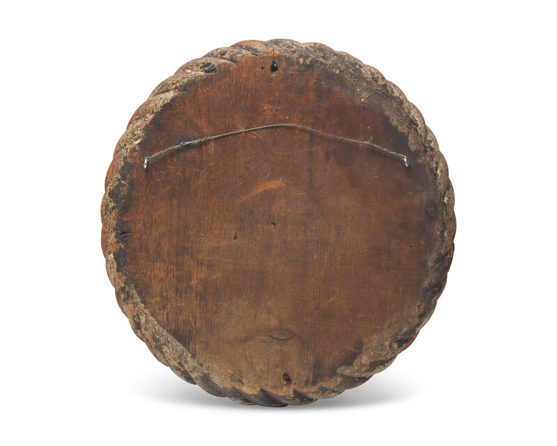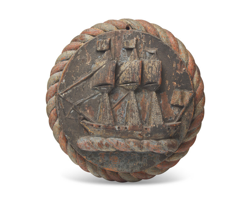 A Round Carved and Painted Wood Plaque of Three Ships