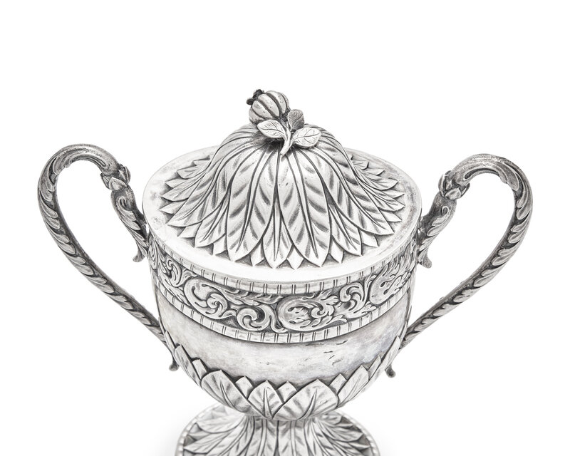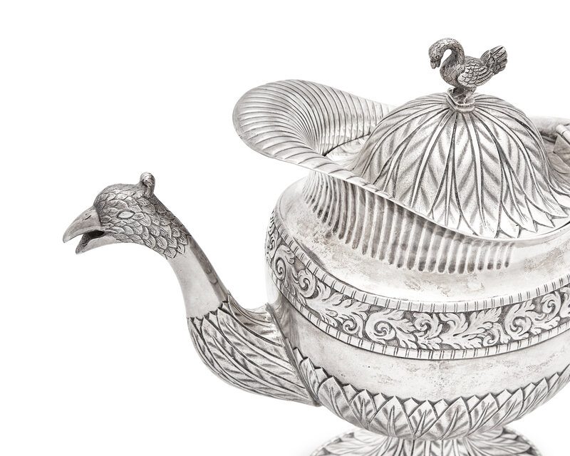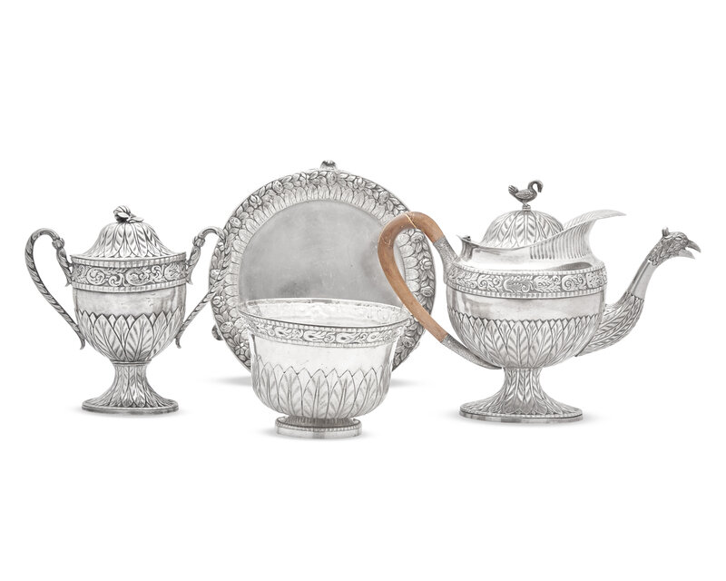 comprising a teapot with bird-form spout and finial, a covered sugar dish with melon-form finial to lid, a waste bowl, and a footed salver / tray, apparently unmarked.