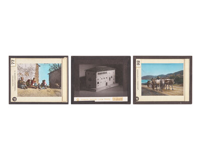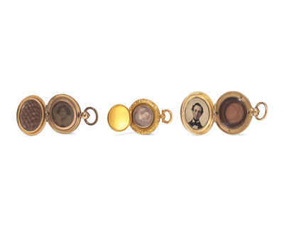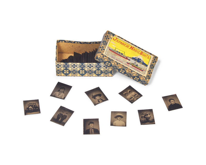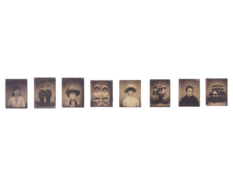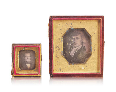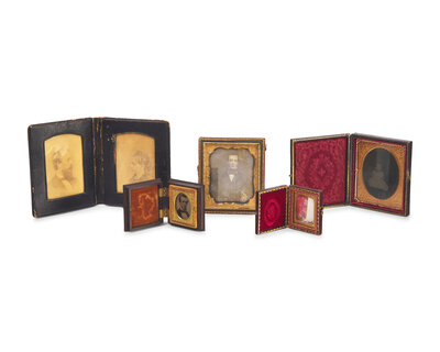 comprising a leather bi-fold containing cabinet card photographs of William Heysham Sayre and Elizabeth Mitchell Sayre, both inscribed and dated verso, "Wm H. Sayre/ Nov. 1874" and "Mrs. E.M. Sayre/ Nov. 1874"; two daguerreotypes, an ambrotype, and tintype depicting William Heysham Sayre, Jr., housed in embossed leather or gutta percha cases, the tintype in gilt locket case with hairwork; two small daguerreotypes and a tintype likely depicting Elizabeth Mitchell Sayre or another Sayre family member, one daguerreotype in an embossed leather case, and the the other house in a gilt locket case, the tintype in a gilt locket case with hairwork; a daguerreotype of a painted portrait miniature of an unidentified gentleman, executed in the late 18th century, and possibly by James Peale (1749-1831), housed in an embossed leather case; a tintype of a young seated infant, housed in an embossed leather case; approximately 93 small tintypes depicting various children and groups of children, some on tricycles, housed in a cardboard "Japanese Magic Boats" box; and fifteen lantern slide plates by Eastman Kodak Co., Rochester, New York, depicting various landscape and city scenes from travels to the Basque Region of Spain, developed by Charles R. Pancoast and S. Hudson Chapman, Philadelphia, Pennsylvania.