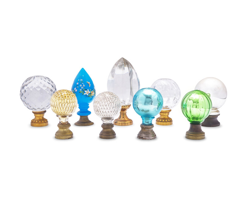 An Assembled Group of Nine Blown and Cut Glass and Metal Newel Post Finials