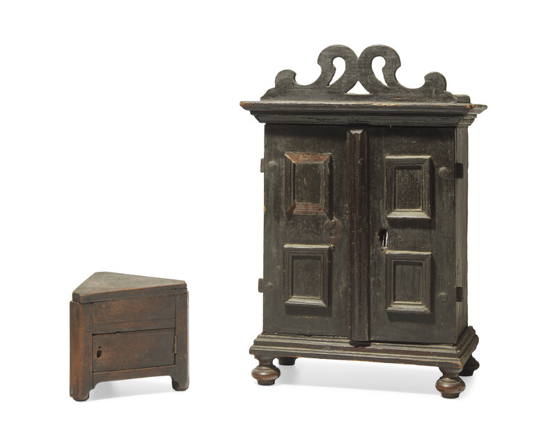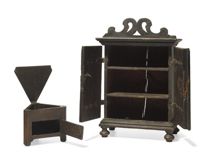 Two Valuables Chests: A Miniature Painted Cupboard and a Walnut Box