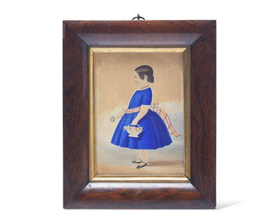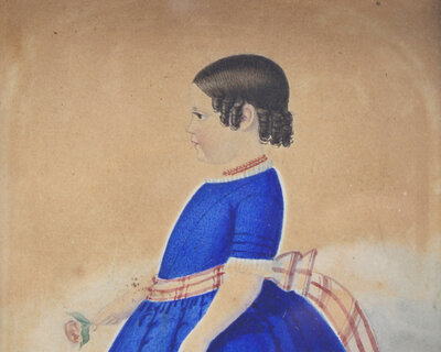 English School 19th Century, A Portrait Miniature of a Young Girl in Blue Dress Identified as Christiana Taylor