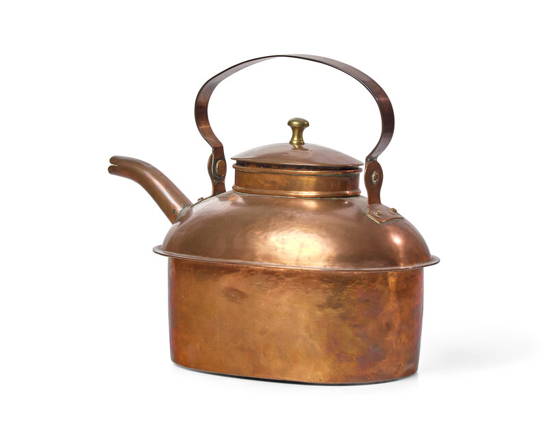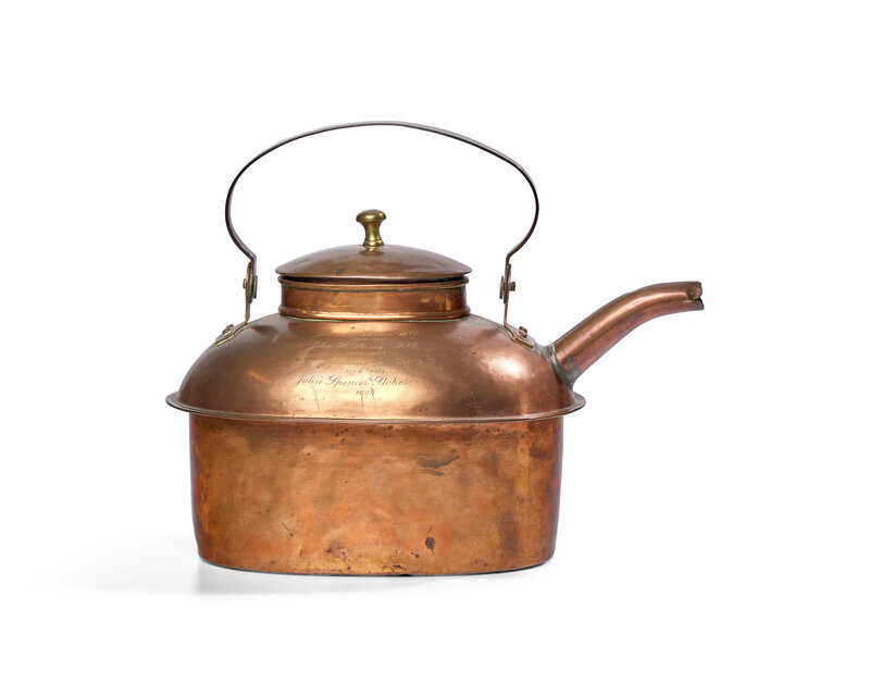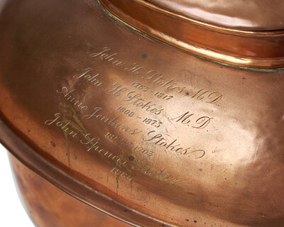 oval form, the lid with brass knob, the underside of handle with impressed numeral, "6," the body engraved, "John H. Stokes M.D. 1765-1817/ John H. Stokes M.D. 1808-1873/ Anne Jenkins Stokes 1844-1903/ John Spencer Stokes 1884."