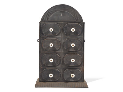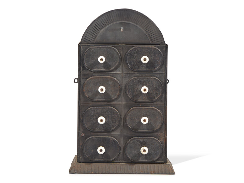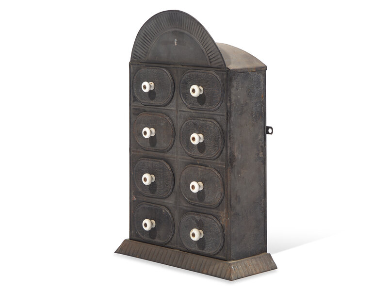 with eight drawers having porcelain knobs, the back edge with brackets for mounting to wall.