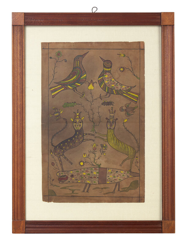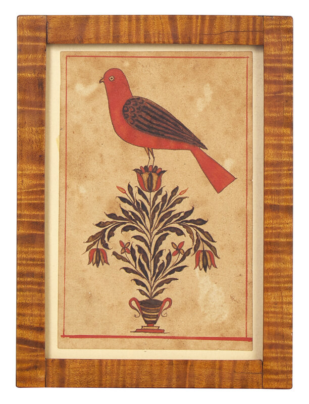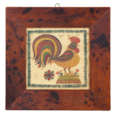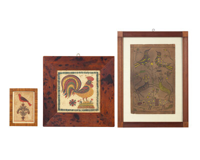 the first, depicting birds, crowned lions, and alligator, ink and gouache on paper, framed, 19th / 20th century; the second, a rooster, done on the reverse of a ledger or account book, the back retaining ink inscriptions, 19th / 20th century, ink and gouache on paper, framed; and the third, a small bookplate depicting a bird resting on tulips issuing from an urn, 19th century, ink and gouache on paper, mounted and framed.