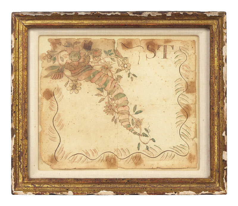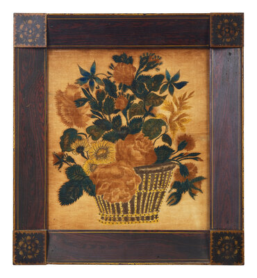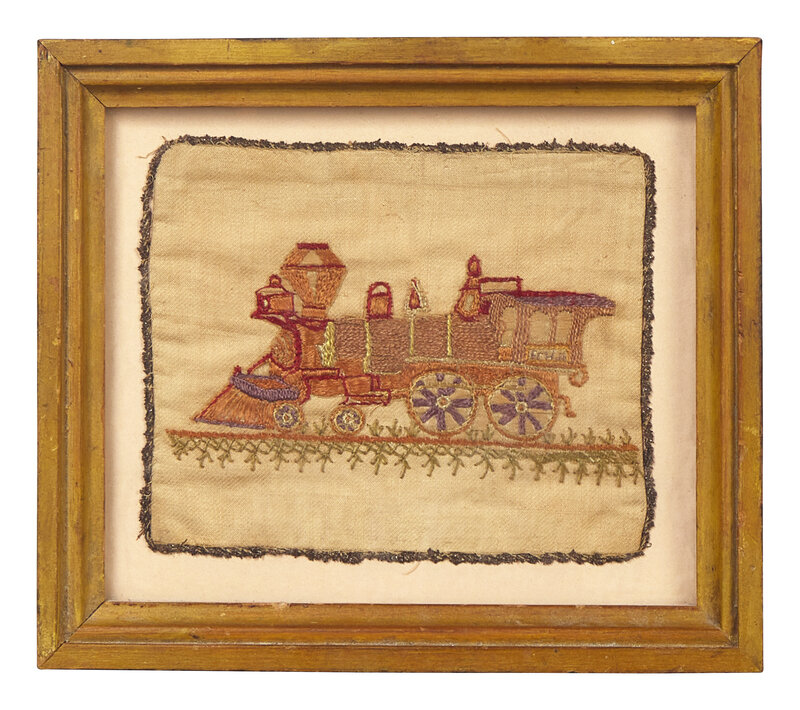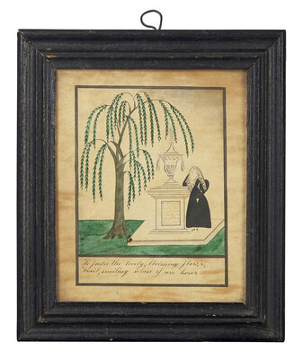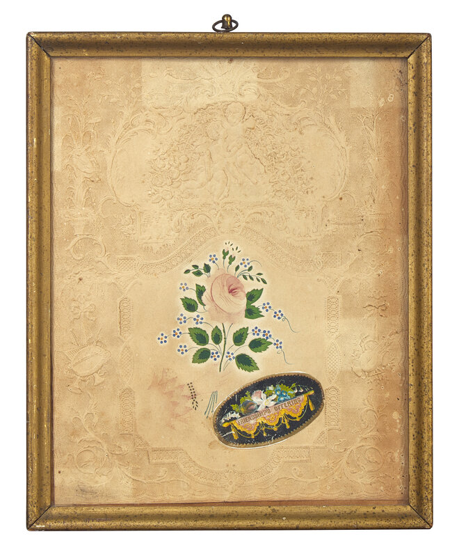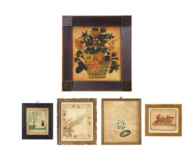 comprising a theorem on velvet depicting a basket with flowers, circa 1825, in a period faux-grained "Hitchcock" type frame; a small mourning picture depicting a mourning lady beside a weeping willow and tombstone inscribed, "To the Memory of a Life Lived/ T. Hills/ he died Oct. 9th 1833/ in the fourth year of his age," the lower register inscribed, "So fades the lovely, blooming flow'r, frail, smiling solace of an hour," watercolor and ink on paper, framed; a hand-drawn bookplate or ledger sheet depicting a cornucopia with flowers and initialed, "S.T.," probably late 18th / early 19th century, watercolor and ink and paper, mounted and framed; a hand-decorated and embossed friendship token, with hand-painted rose and flowers and applied label inscribed, "Friendship's Offering," late 19th century, framed; and an embroidered needlework picture of a train, late 19th century, mounted and framed.