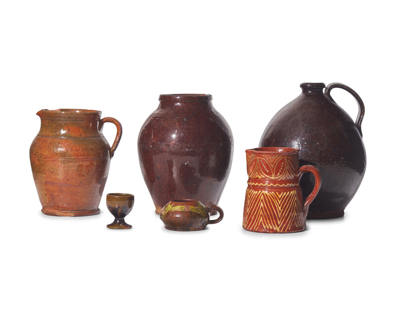 comprising a brown-glazed jug, an orange glazed pitcher, a brown-glazed ovoid crock, a green and brown-glazed egg cup, a small brown and green-glazed cup, and a slip-decorated pitcher.