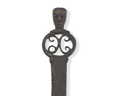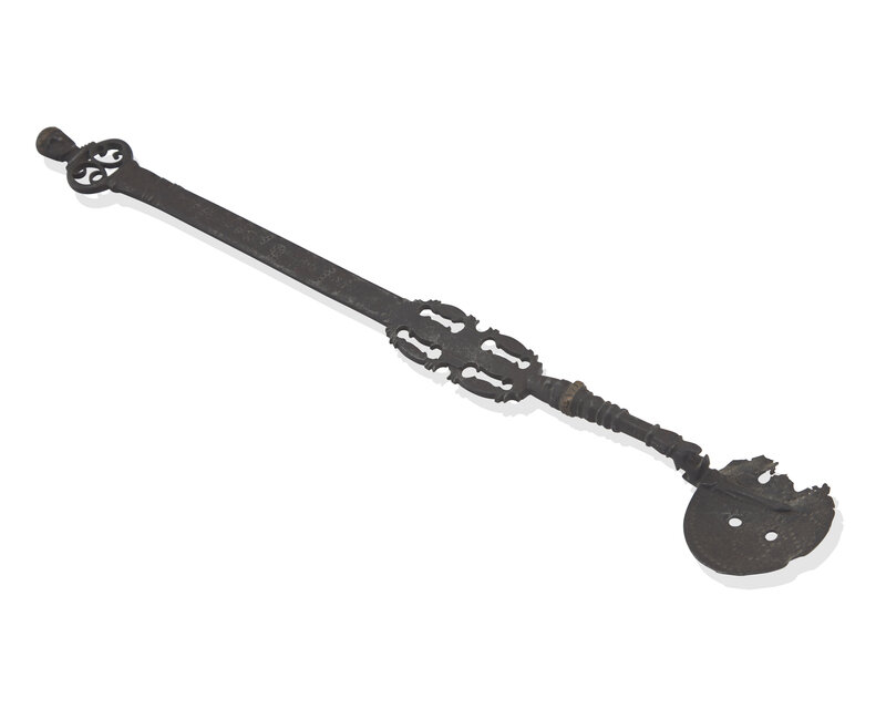 A Copper-Inlaid Wrought Iron Slotted Spoon with Human Head-Form Terminals