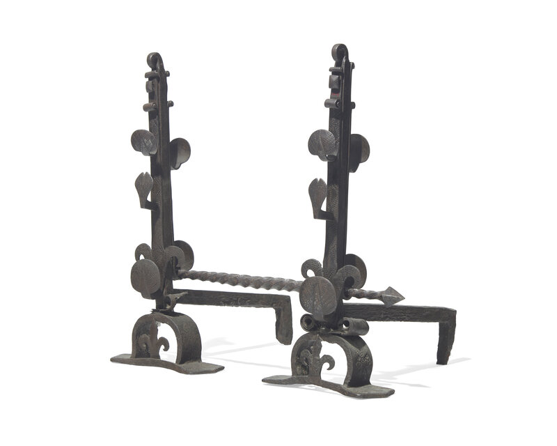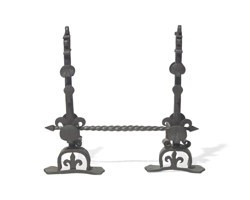 designed after 17th-century examples, each andiron with five hooks for crossbars / skewers, decorated with punchwork and fleur-de-lis, one hook each engraved with monogram, "ID," the crossbar with twisted rod and pointed / faceted finials, 18th century or earlier; one andiron bearing painted accession number, "1213."