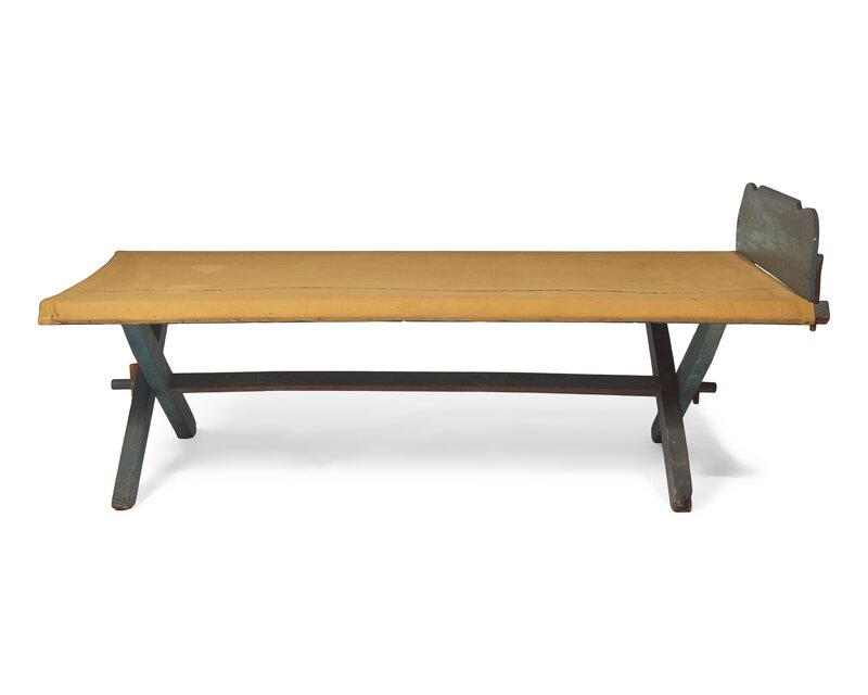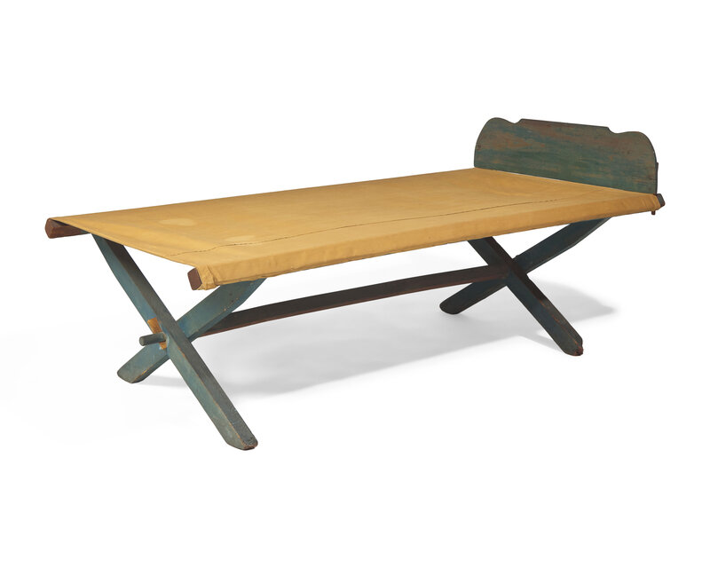 of sawbuck form with detachable shaped headboard, with a canvas "spring."