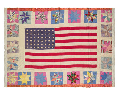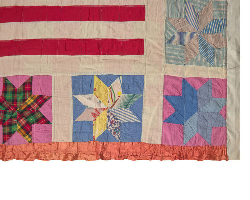the 48-Star cotton parade flag with printed canton and stitched stripes with two grommets and manufacturers stamp on header, is enclosed by a border of eight-pointed stars comprised of solid and variously printed patches, machine and hand-sewn.