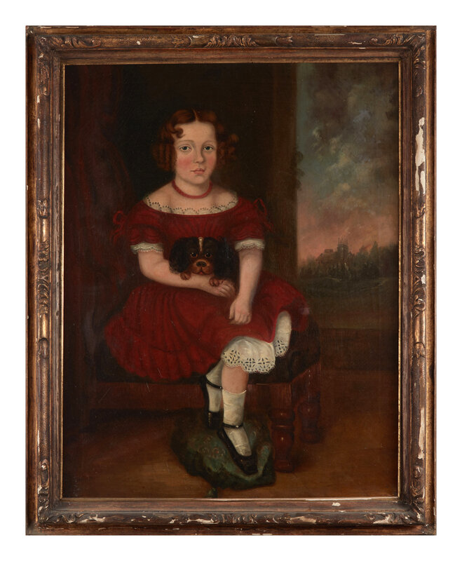 American School 19th Century, Portrait of a Young Girl with a Puppy