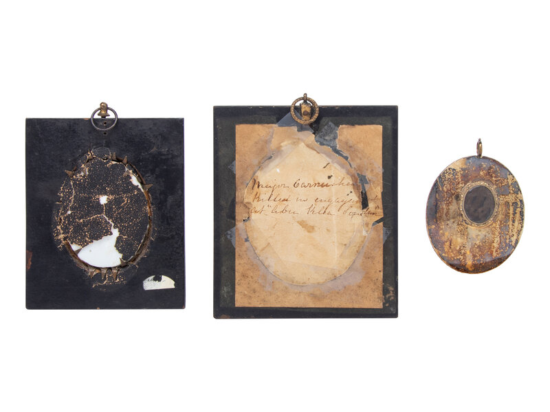 the first, a portrait of a child, inscribed verso, "Major Carmicheal/ Killed in engagement/..." watercolor on paper, housed in black frame; the second, a reverse-glass painted profile silhouette of a woman, backed with porcelain plaque, housed in a black frame; and the third, a portrait of a young woman, watercolor on paper, housed in a gilt pendant case, verso with aperture containing hairwork.