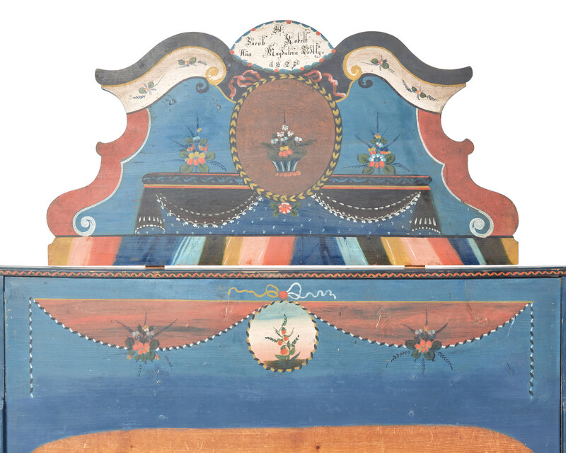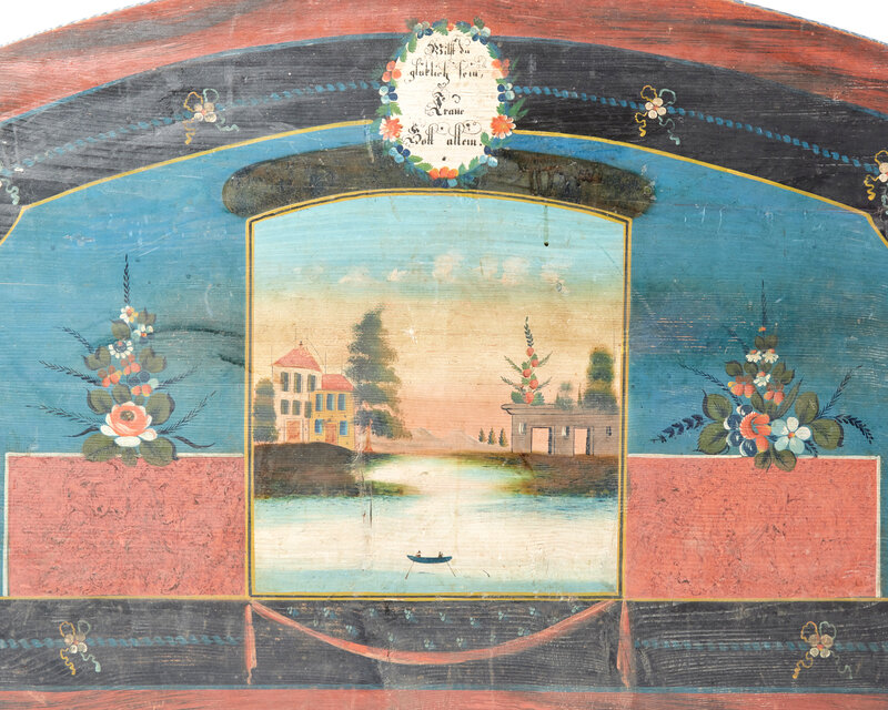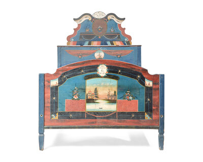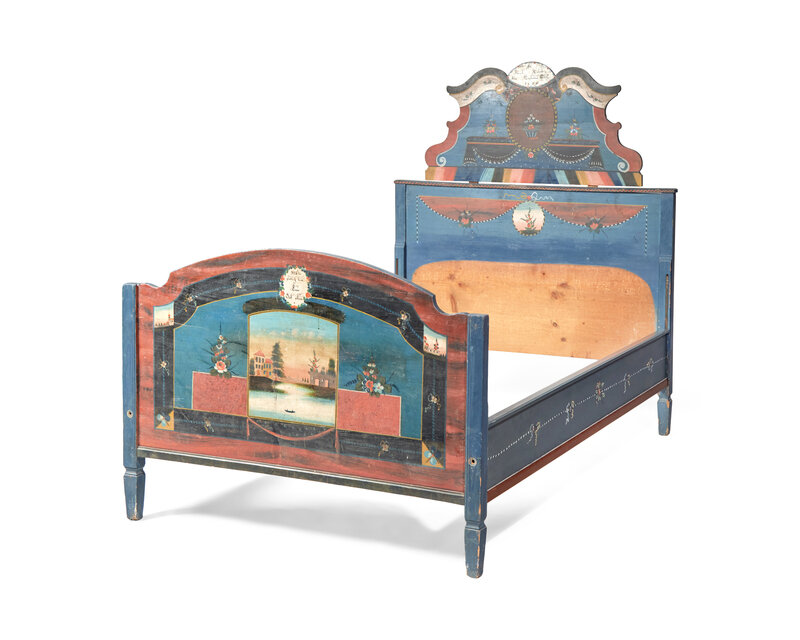 the headboard with detachable upper crest, inscribed and dated, "...Jacob Kobelt/ Ana Magadalena Lodtly 1827", the footboard with scene depicting boaters on a placid lake, and roundel inscribed with German expression, with the original side rails as well as later side rails made for modern use.