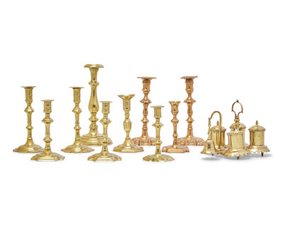 A Group of Ten Brass Candlesticks and a Brass Standish