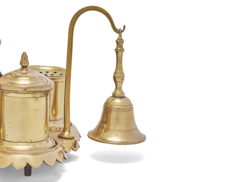 comprising a large candlestick, probably Russian; and nine English candlesticks, including three pairs and two singles; and a standish, with inkwell accessories and bell; bearing accession numbers, "69.78", "69.40", "92.27", "66.62", "82.79", "65.43", "92.27", and "85.22."