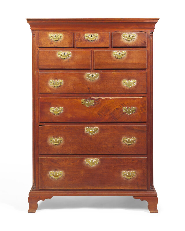 with flat molded cornice, quarter columns, with a series of three short drawers, above two short drawers, over four graduated long drawers, on molded base with ogee feet.