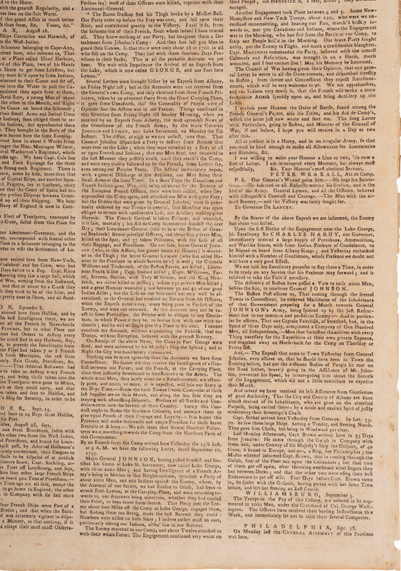 The issue features an inside-page report on the Battle of Lake George, which took place on 8 September 1755, during the French and Indian War. American William Johnson, building Ft. William Henry with 3,500 Colonials and 400 Indians, defeats Baron Dieskau in the Battle of Lake George, NY.