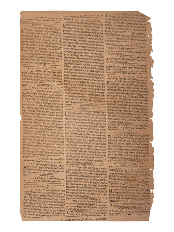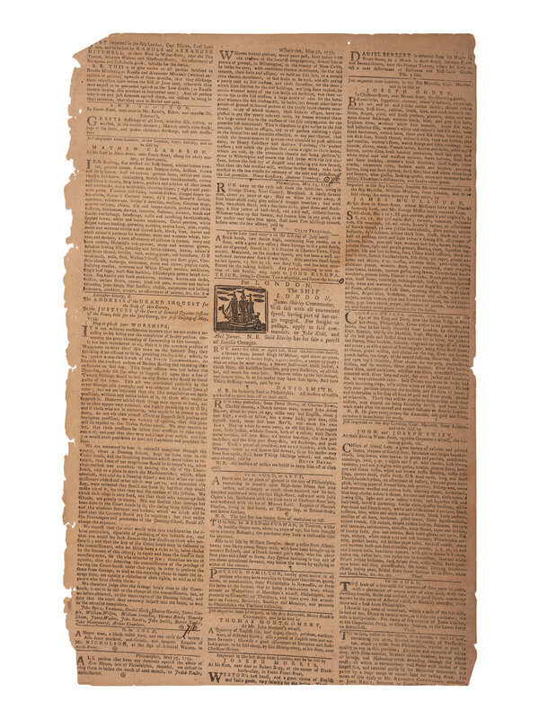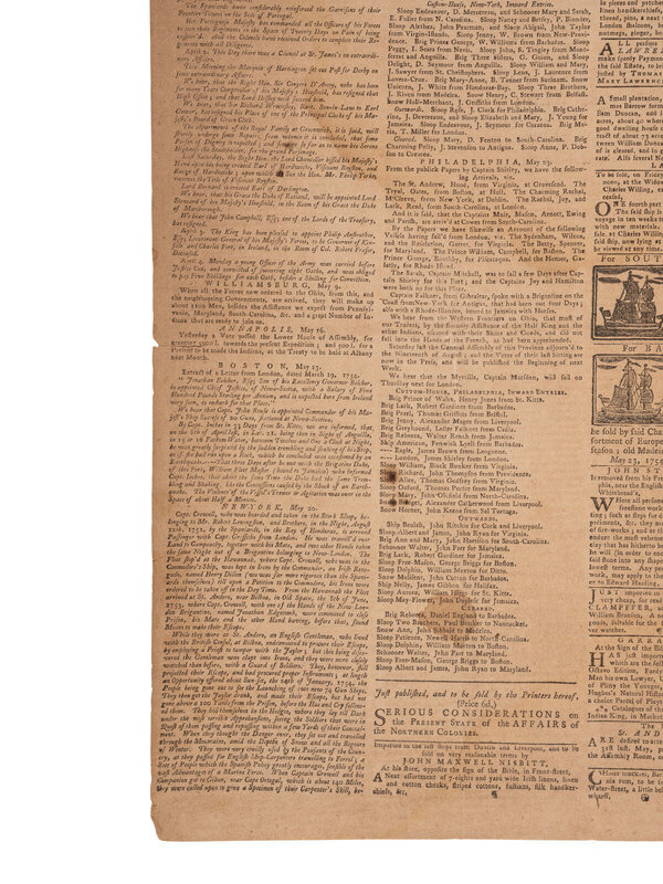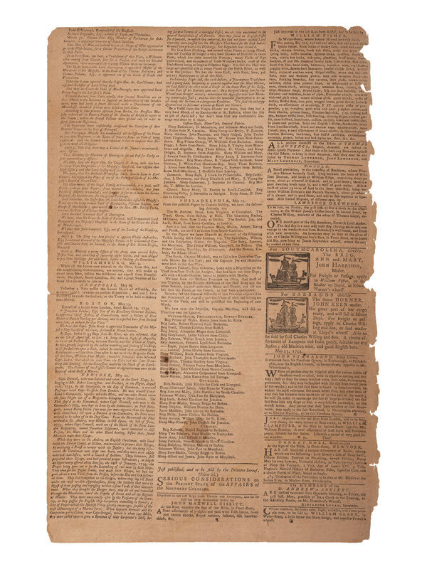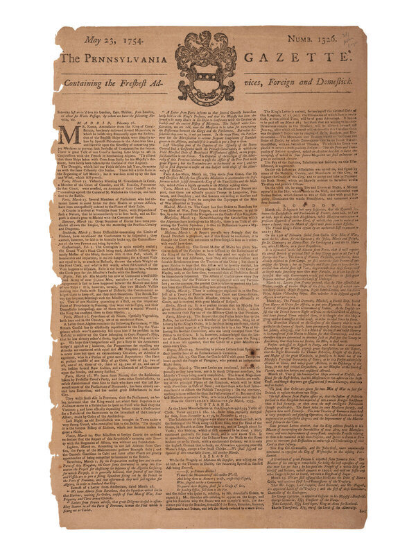 The Pennsylvania Gazette. No. 1326. Philadelphia, PA: [Benjamin Franklin], 22 May 1754. 4pp., folio, 25 x 18 1/4 in. 4pp., folio, 14 3/4 x 9 1/2 in. This issue was originally produced as a 6-page newspaper with the last page (page 5/6) being solely an advertising supplement. Thus, this is a 4-page issue, lacking the Ben Franklin imprint colophon, which was located at the bottom of the advertising leaf. (Fully separated at centerfold. Chipping to edges. Toning, occasional soiling.)