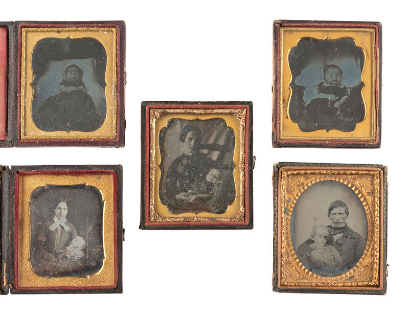 Subjects include: 2 sixth plate daguerreotypes of mothers seated with their infants resting in their laps (each with tarnish to edges, spotting on plates). -- 2 sixth plate daguerreotypes of infants resting peacefully (each image a bit dark, one with some light spotting to edges). -- Sixth plate ambrotype of a downtrodden looking man holding a gaunt-looking child, either near death or possibly after death, housed in pressed paper case with penciled notation behind image, "Robert M. Jeffers and Roby (?) Jeffers." (wear to image and emulsion; case fully separated at hinge and heavily worn). -- Together, 5 images. Conditions vary.