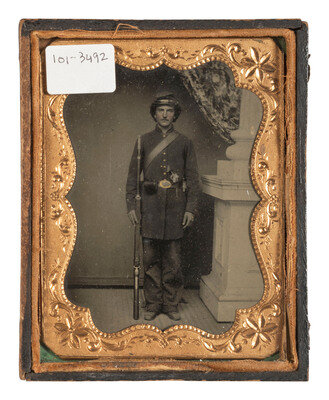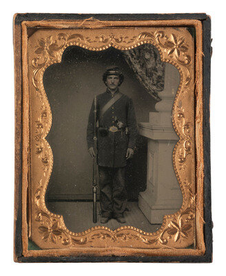 Quarter plate full standing studio portrait of a Union soldier with long hair and mustache, wearing a his cartridge sling and belt rig complete with cap pouch and gold-highlighted oval belt plate. He holds an 1861 Springfield rifle to one side and has a revolver (possibly a Moore Revolver) tucked into his belt. (Image plate with some scratching, rubbing, and other minor imperfections; unsealed.) Housed loosely in a half pressed paper case under mat and glass only (losses to case).