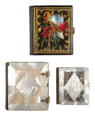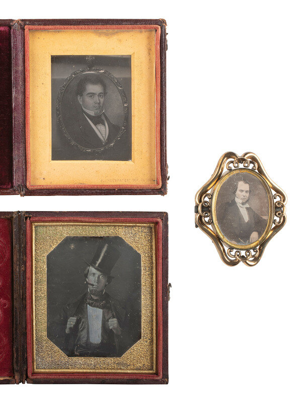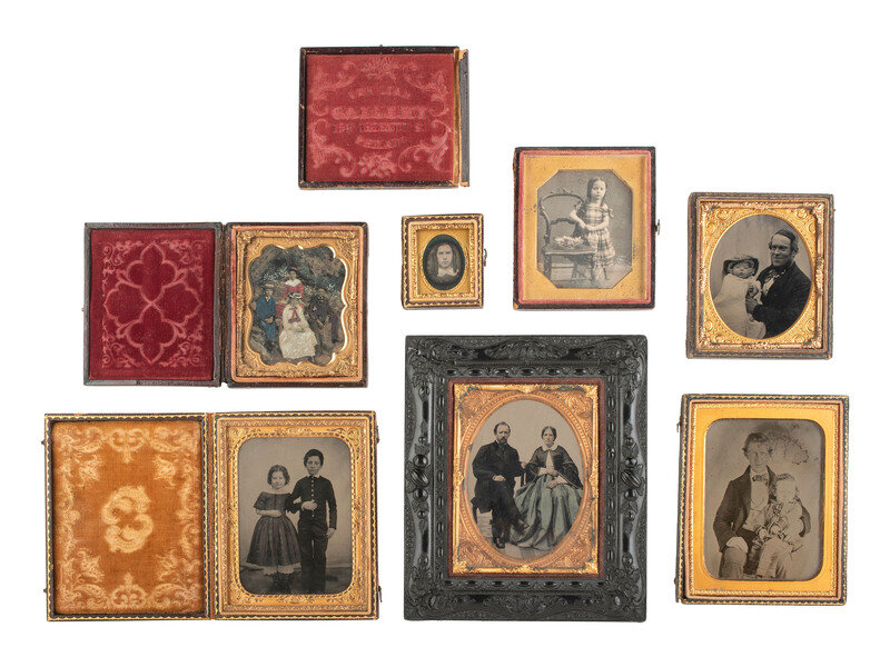 Sixth plate daguerreotype of a young girl standing with her arm through the back of a chair, the chair having a glass bowl filled with some undiscernible object on it. (Some clouding and fuzziness, possibly to glass but difficult to tell, spotting to mat, no preserver present.) Housed in a fully separated leatherette case with velvet pad stamped for VAN LOAN's gallery, Philadelphia (split at spine, loss to upper edge of front cover). -- Sixth plate daguerreotype of a younger bearded man wearing a tall top hat tilted on his head, having a cigar hanging out of his mouth, and posing with his hands holding onto his lapels. (Tarnishing, some clouding, spotting, and dust specs, spotting to mat.) Housed in a leatherette case (general wear). -- Sixth plate ambrotype of a bearded gentleman with a comb over holding a baby wrapped in a blanket and wearing a hat. (Re-blacked and resealed 1997.) Housed in a half pressed paper case (general wear). -- Sixth plate daguerreotype portrait of a teenaged young man with long hair, posed resting his elbow on a book on the table next to him. (Significant tarnishing to edges, spotting and specs throughout, no preserver present.) Housed in a mother-of-pearl case (general wear). -- And 10 others, including 3 quarter plate ambrotypes, 3 sixth plate daguerreotypes, one sixth plate hand-colored tintype, one ninth plate daguerreotype, one daguerreotype housed in a piece of pinback jewelry, and one sixteenth plate daguerreotype. Conditions and housings vary. -- Together, 14 images.