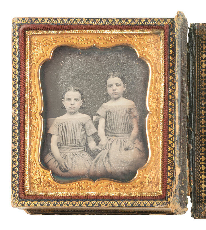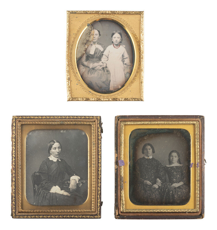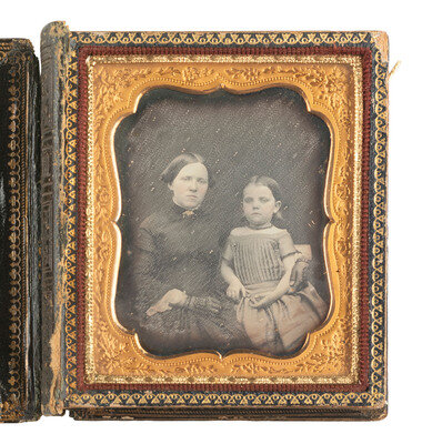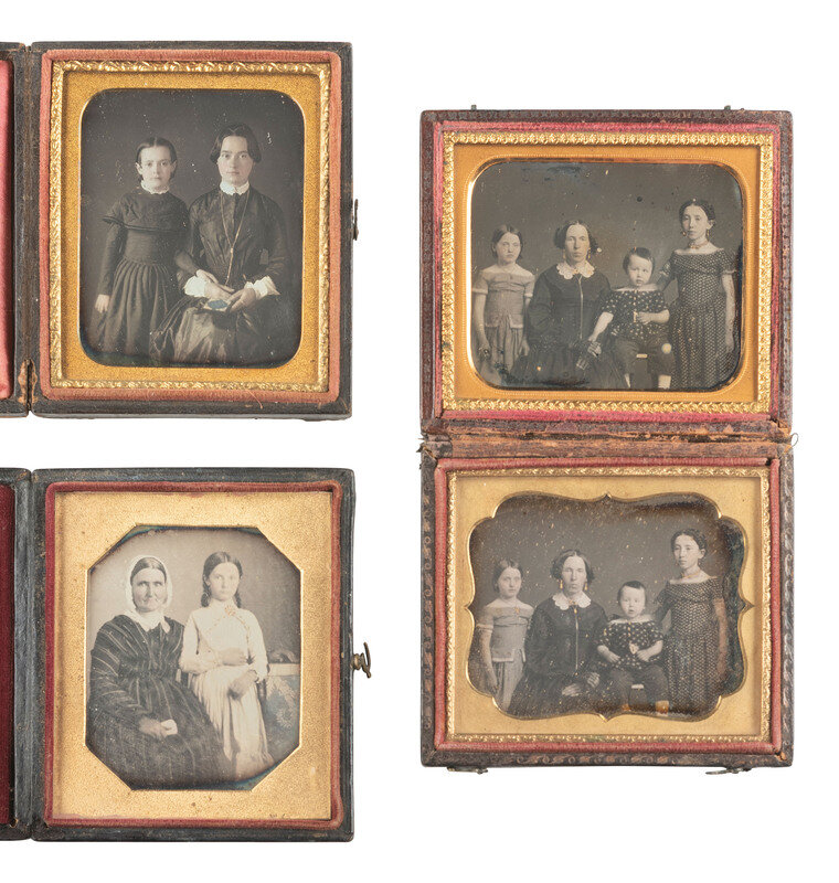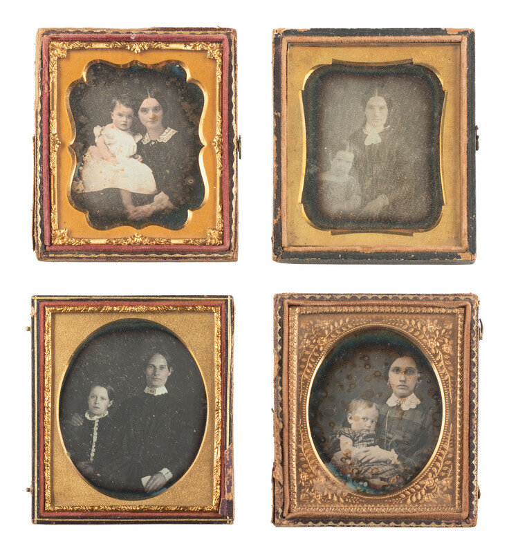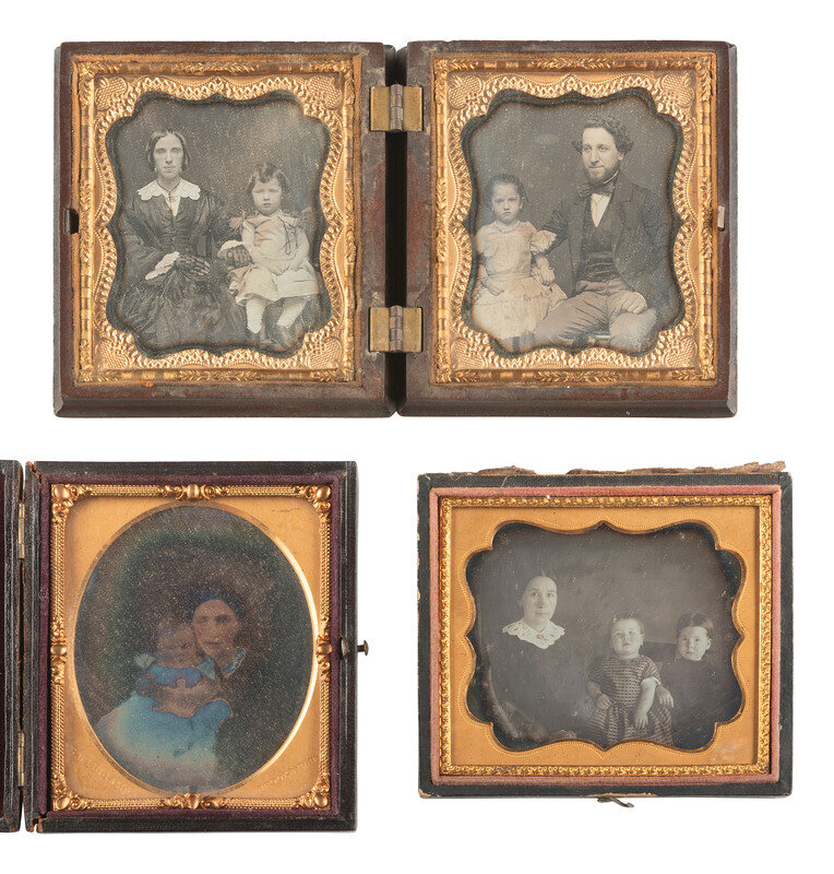 A pair of landscape-oriented daguerreotype portraits from the same sitting, featuring the same woman and three children. There are subtle differences between the two exposures, including the toddler's facial expression, but their poses remain the same. (Some tarnishing and spotting to both images.) Housed together in a pressed paper case (general wear). -- A lovely portrait featuring young lady and a young girl, possibly siblings. The older girl holds a cased image on her lap. (Minor tarnishing to edges, few other imperfections.) Housed in a pressed paper case (surface wear/loss). -- And 13 others. Some without cases or full cases. Some housed together in one case. Conditions vary. -- Together, 16 sixth plate daguerreotypes of family members.