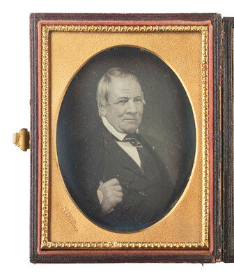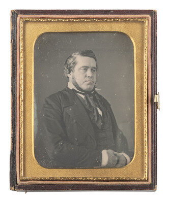 Seated portrait of a portly gentleman with longer, combed over hair and a mustache. (Tarnish and oxidation spots to plate, some spotting to mat.) Housed in a fully separated leatherette case (wear). -- Seated portrait of a younger gentleman holding a book up on his leg with one hand and wearing a very serious expression on his face. (Tarnishing, clouding, wiping to plate, spotting to mat.) Housed under mat, glass, and preserver only; no case. -- And 16 others, incl. two images housed in a partial front/back case. Some without cases. Conditions vary. -- Together, 18 daguerreotypes of men housed in quarter plate cases.