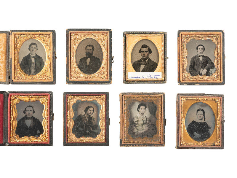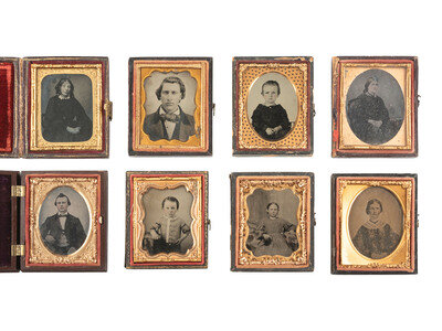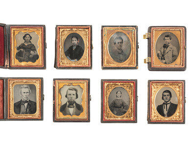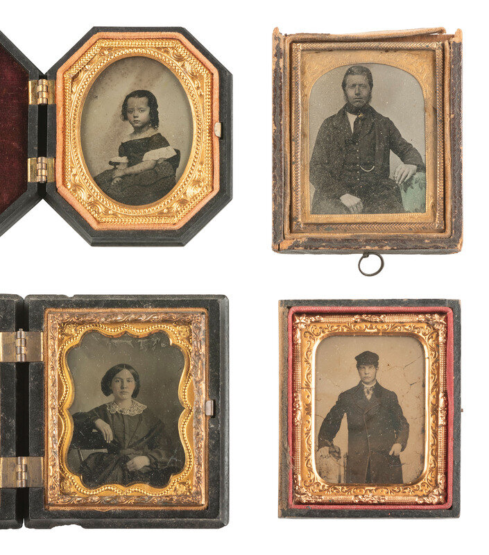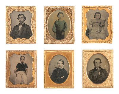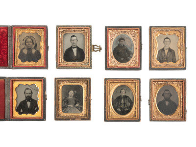 Ruby ambrotype seated portrait of a young lady wearing a plaid dress and holding a book upright on her lap. (Image with good contrast.) Housed in a pressed paper case (significant wear and separation). -- Tintype bust portrait of an elderly gentleman with a severe gaze and somewhat untidy hair, looking directly into the camera lens. (Minor imperfections, image quite crisp.) Housed in a pressed paper case (surface wear, loss). -- Ambrotype portrait of a young man. (Image with some discoloration and clouding, bit dark, mat and preserver with discoloration and oxidation.) Housed in a fully separated pressed paper case (surface wear). Brass mat stamped, "KIMBALL / 347 BROADWAY N-Y." Interior of case inscribed, "Taken July 7th 1858." -- Ambrotype portrait of a young lady wearing gold-highlighted jewelry and a pink-tinted hair ribbon. (Image a bit dark, few imperfections.) Housed in a fully separated pressed paper case (surface wear, loss). -- And 38 others. Some without cases. Conditions vary. -- Together, 42 ninth plate ambrotype and tintype portraits of men, women, and children.