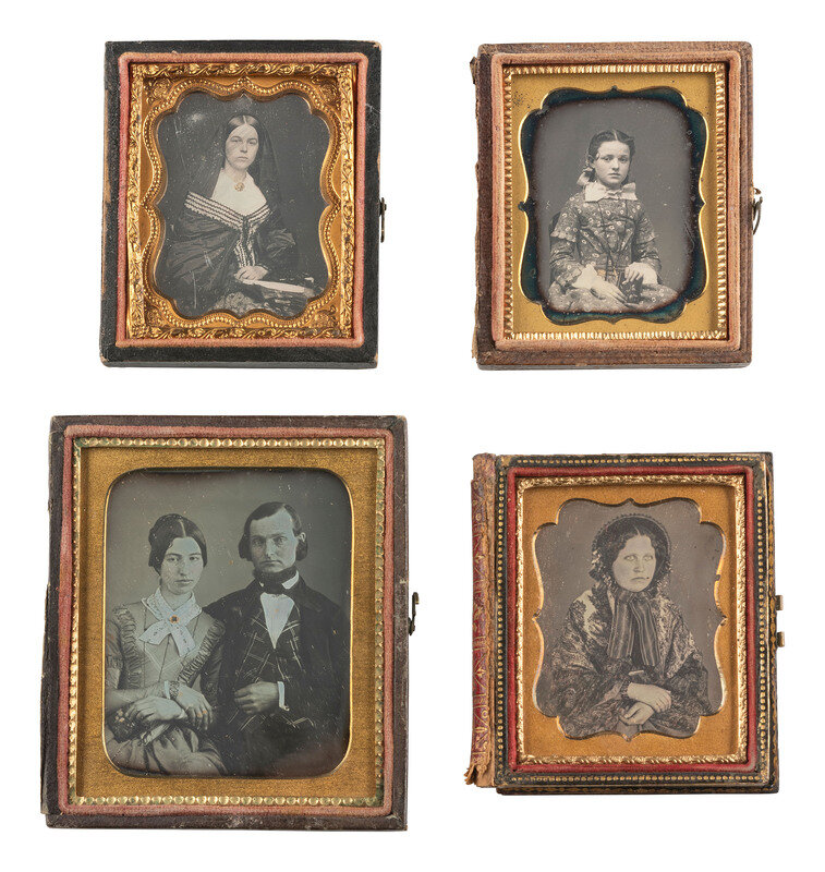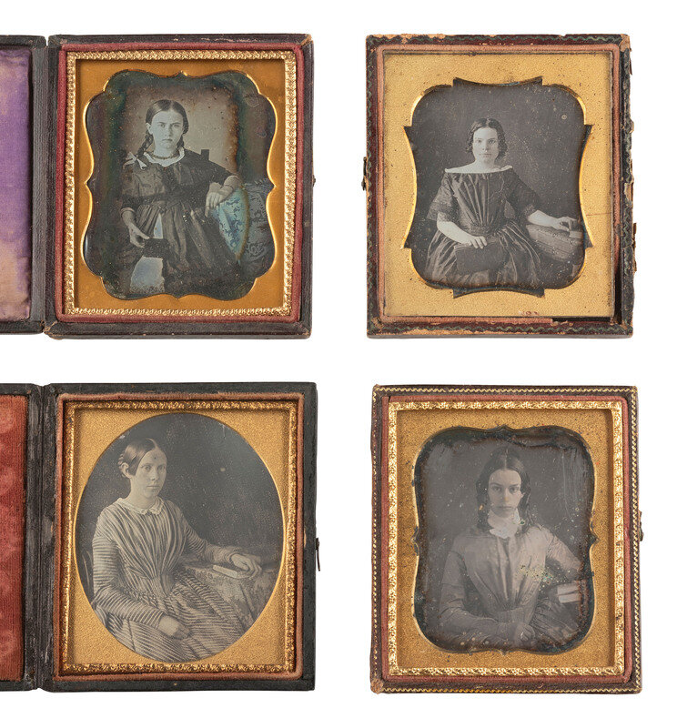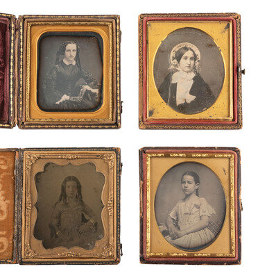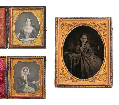 A charming half plate ambrotype portrait of a young girl seated at a table upon which is strewn what appear to be books or cased images. The girl rests her elbow on the table and holds a finger into her cheek, in a thoughtful pose. (Some wear and flaking to lacquer, image a bit dark; no preserver.) Housed in a fully separated pressed paper case (surface wear). -- Sixth plate daguerreotype portrait of a lady holding what appears to be a hand fan in her lap. (Some stray faint scratches to plate, very few other imperfections.) Housed in a pressed paper case (surface wear). -- Sixth plate daguerreotype portrait by ANSON featuring a young freckle-faced girl wearing a fine bonnet. (Some spotting and other small imperfections to plate.) Housed in a pressed paper case (surface wear). Brass mat stamped with Anson's name and 589 Broadway address. -- And 16 others, including 12 sixth plate daguerreotypes, one sixth plate tintype, and 3 ninth plate daguerreotypes. -- Together, 19 cased images of females with props and/or noteworthy accessories.