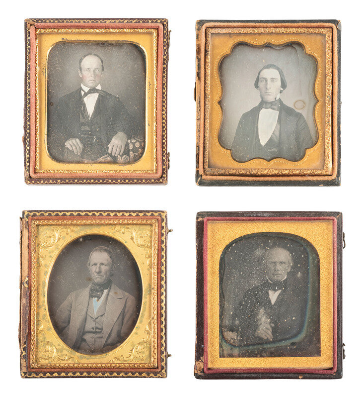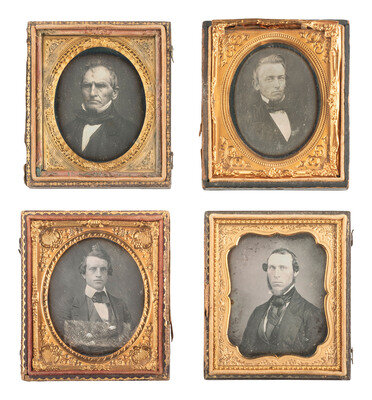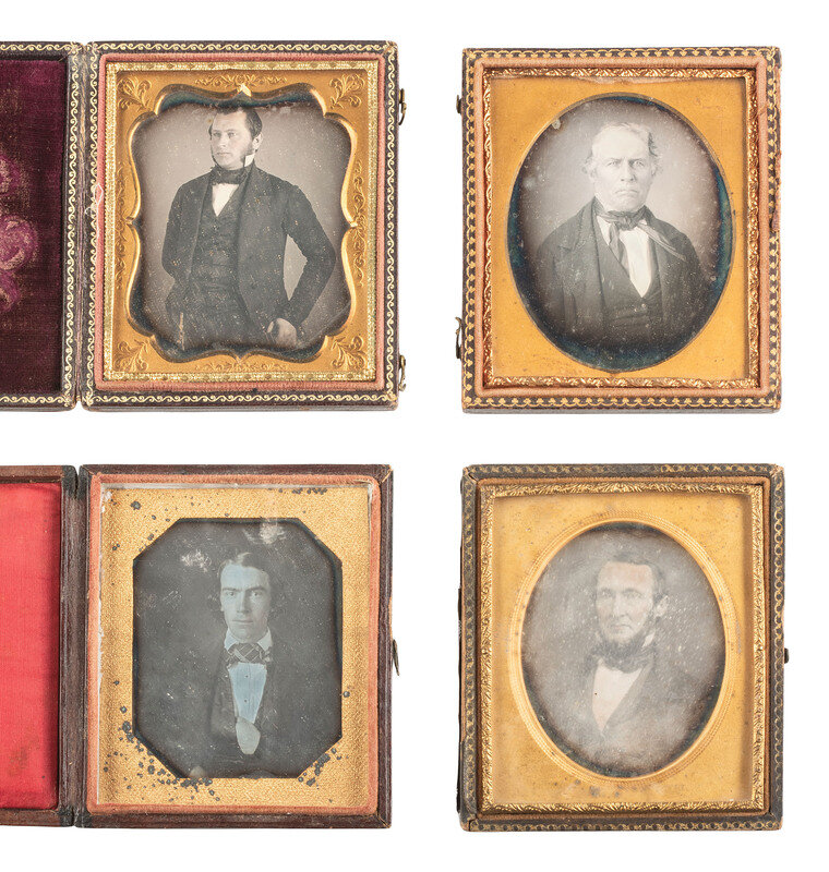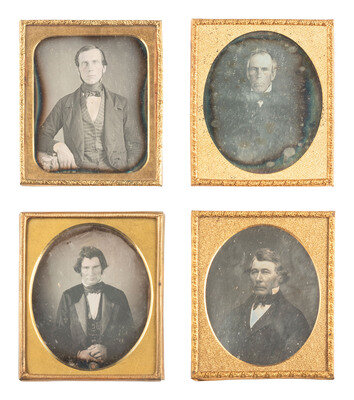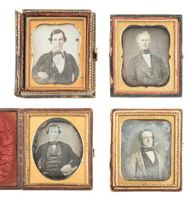 Seated portrait of a young to middle aged man wearing a double-breasted waistcoat, holding what appears to be a handkerchief in one hand, and looking directly into the camera with a hypnotizing expression. (Tarnishing, spotting, some scratches to edges of plate.) Housed in a pressed paper case (general wear, splitting to spine). -- Seated portrait of a gentleman with notable sideburns and a square jaw, wearing a plaid waistcoat and gazing icily toward the camera. (Some clouding and few other imperfections to plate.) Housed in a half leatherette case (surface wear). -- And 18 others. Some without cases. Conditions vary. -- Together, 20 sixth plate daguerreotypes of men of various ages, sporting serious, severe, brooding, and haughty expressions.