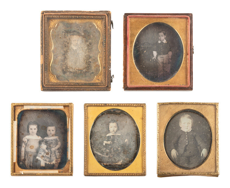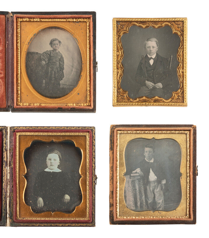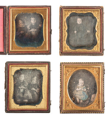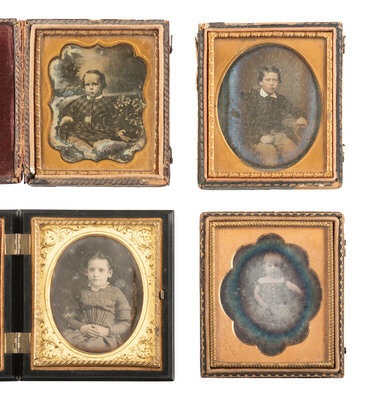 Standing portrait of a young boy with one arm resting on a pair of books surmounting a cloth-covered table next to him. (Clouding to plate.) Housed in pressed paper case (damage, cracks, loss). -- Standing portrait of a young boy with somewhat disheveled hair, leaning an arm against a table next to him and giving the camera a smirking expression. (Some tarnishing and other imperfections to plate, spotting to mat.) Housed in a full pressed paper case (general wear). -- And 19 others. Some without cases. Conditions vary. -- Together, 21 sixth plate daguerreotypes featuring children.