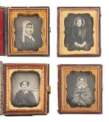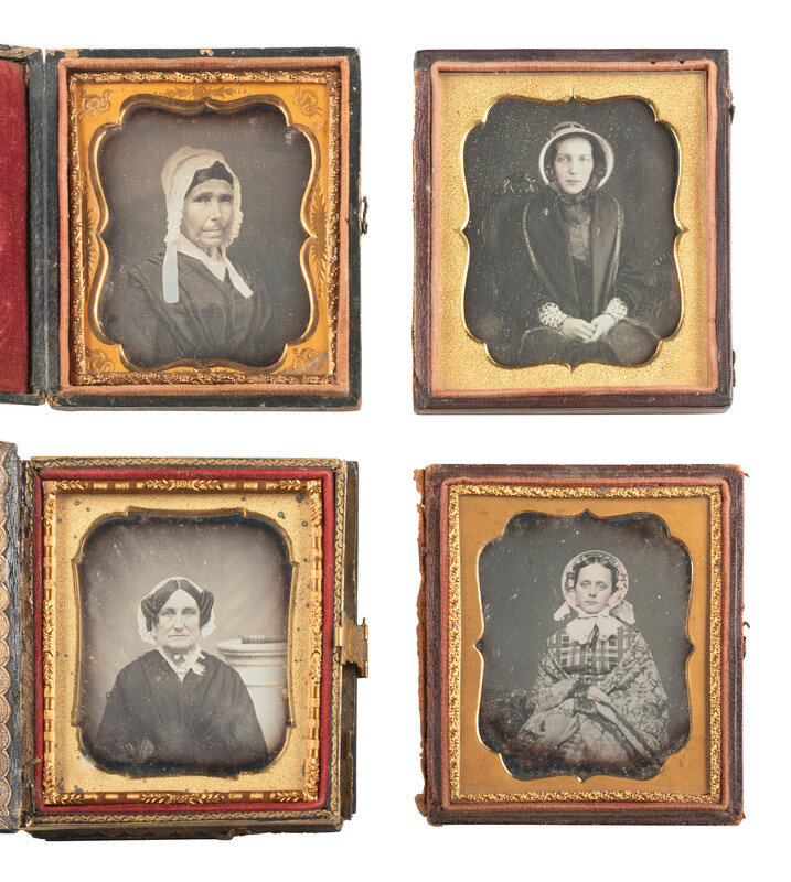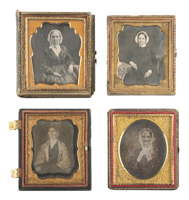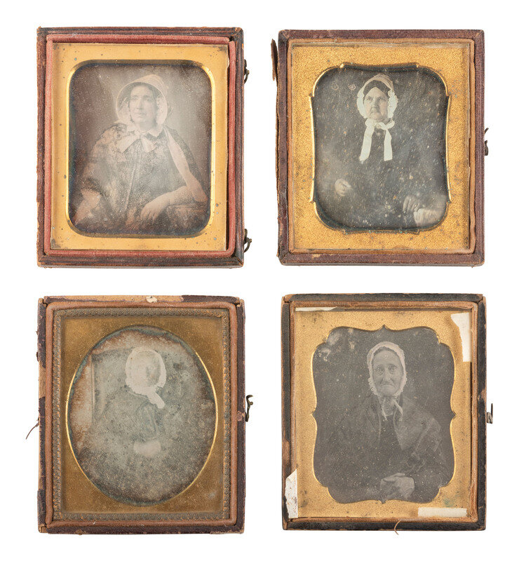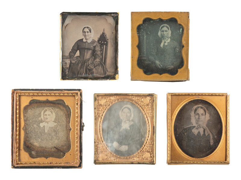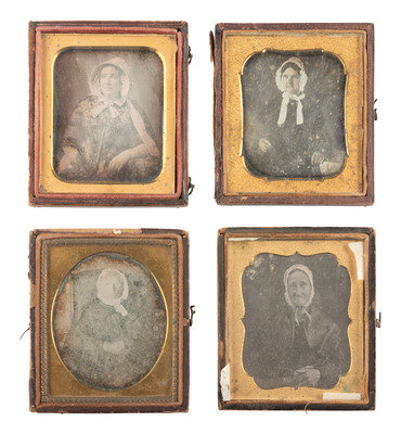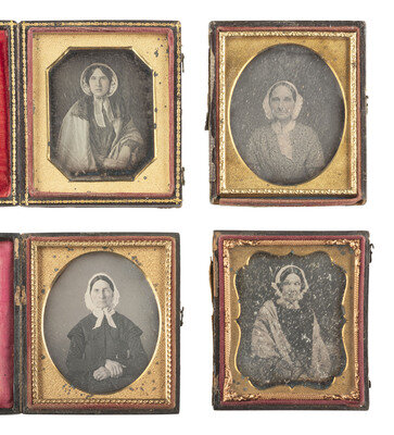 Crisp head-on portrait of a seated woman of mature age, with her hair arranged up in tightly-coiled curls on either side of her head and wearing a cloth bonnet at the back of her head. (Tarnishing to edges, some other imperfections, spotting to mat, otherwise crisp image.) Housed in a book-style case with mother-of-pearl inlay (heavy surface wear and some loss). -- Seated portrait of a young lady wearing a plaid dress, ornate shawl, lace fingerless gloves, and a beautiful hat with pink-tinted flowers to the interior. (Tarnishing to edges, few pricks and abrasions to plate.) Housed in a fully separated leatherette case (surface wear). -- And 19 others. Some without cases or housings. Conditions vary. -- Together, 21 sixth plate daguerreotypes of women of varying ages, wearing bonnets or hats.