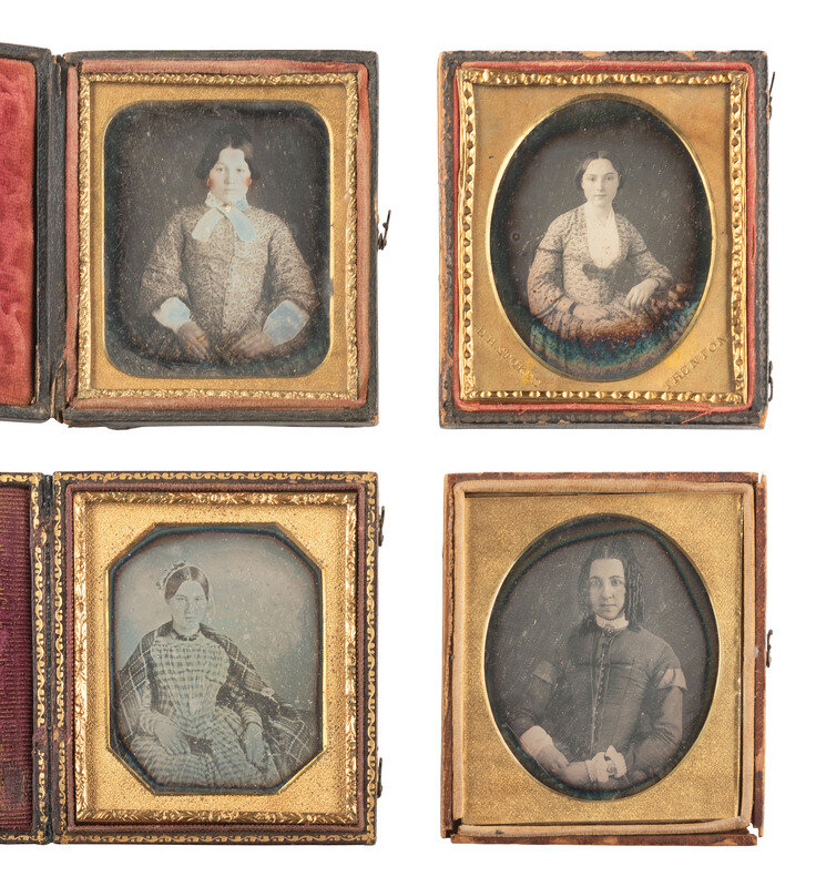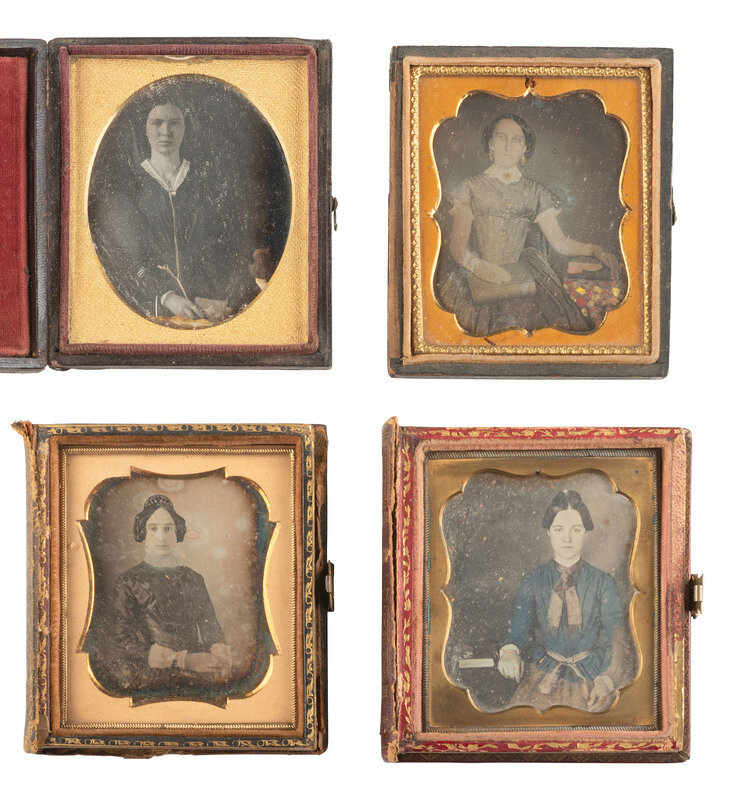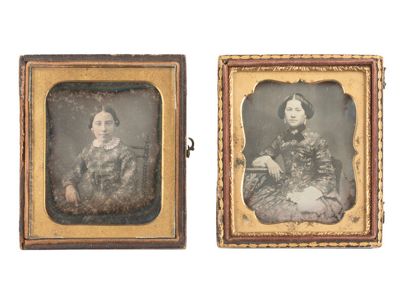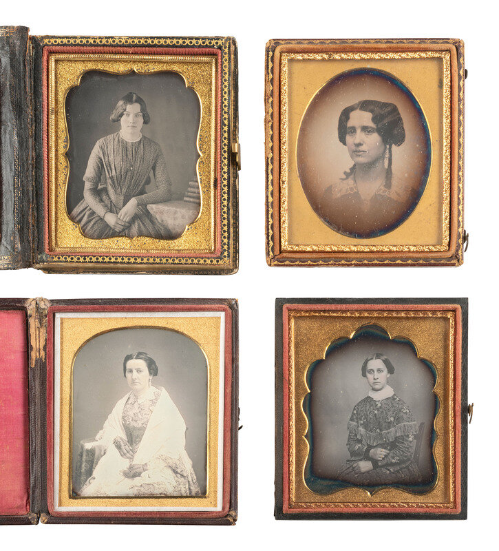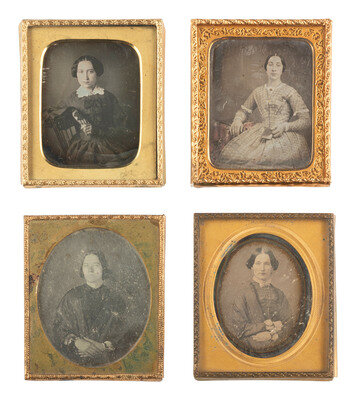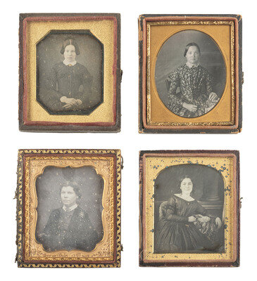 Crisp seated image of a woman wearing fingerless lace gloves, a large shawl, and drop earrings. She also wears a rather somber facial expression. (Minor tarnishing to edges, very few imperfections, image rather clear; reglazed and resealed; no preserver.) Housed in a leatherette case (surface wear). -- Crisp seated portrait of a young woman sitting next to a table upon which rests her elbow and a stack of at least 5 volumes. (Rather clear image, spotting to mat and preserver; resealed 1998.) Housed in a book-style case with hand painting and mother-of-pearl inlay (general wear). -- And 20 others. Some without cases. Conditions vary. -- Together, 22 sixth plate daguerreotypes of young adult women.