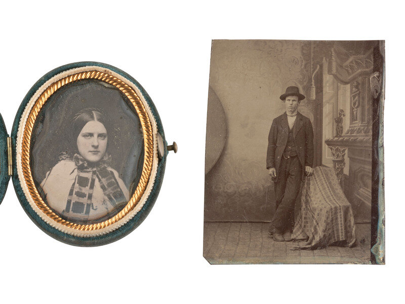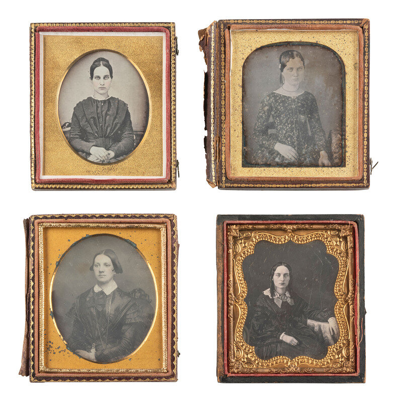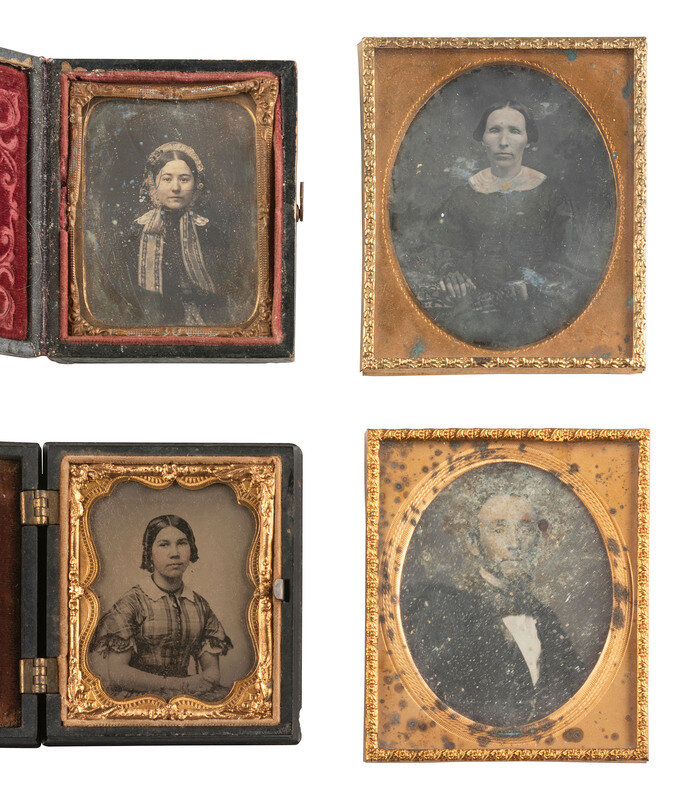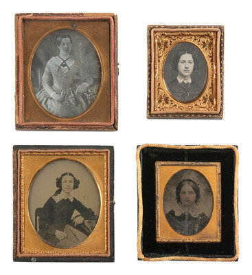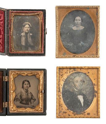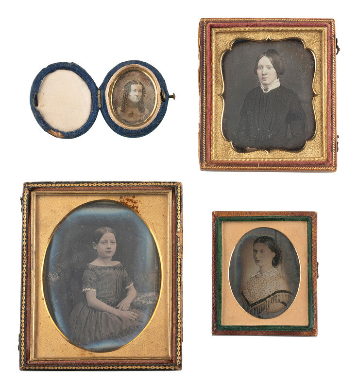 Quarter plate daguerreotype portrait of a young girl seated next to a table. The girl wears a dress with pleated bodice and has rings on at least 3 of her fingers. (Image somewhat clouded and tarnished, light weeping to glass, spotting to mat.) Housed in a half pressed paper case (surface wear). -- Sixth plate daguerreotype portrait of a lady identified on calling card accompanying image as "A. E. Newton," aged 23 in 1850. (Some tarnishing to edges, few spots and specs.) Housed in a fully separated leatherette case (discoloration, wear). -- Sixteenth plate oval daguerreotype portrait of a young lady with her hair worn down in curls, sporting an off-the-shoulder dress and a decently-sized cross necklace visible against her skin. (Heavy tarnishing, a few other imperfections.) Housed in an oval blue velvet push-button case (significant wear and losses). -- Ninth plate ambrotype portrait of a woman housed in a fully separated case marked for "Mr. George Ruff/ Artist and Photographist / 45 Queens Road Brighton." -- And 18 others including 7 sixth plate daguerreotypes, one sixth plate ambrotypes, 5 ninth plate daguerreotypes, 3 ninth plate ambrotypes, and 2 tintypes (one loose plate, one housed under glass and preserver only. Some without cases. Conditions vary. -- Together, 22 assorted images of people.