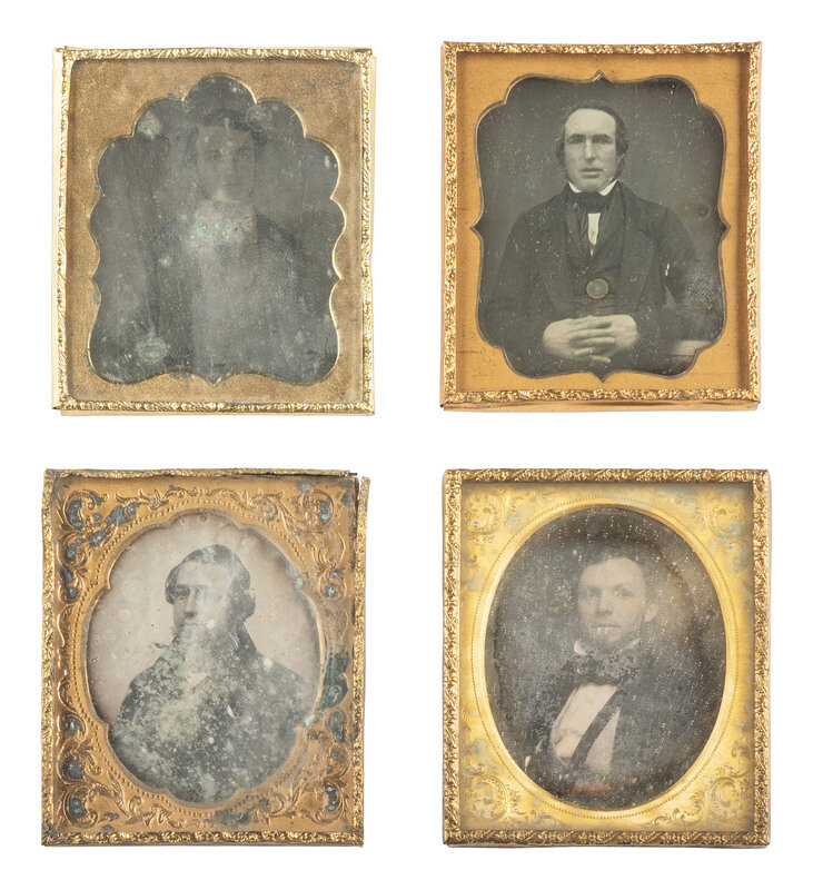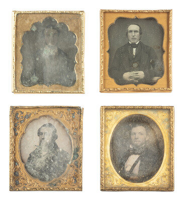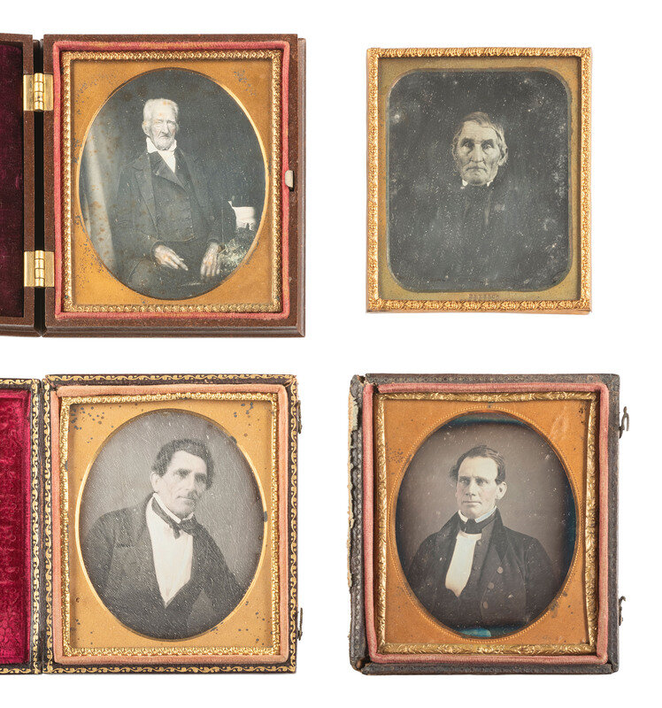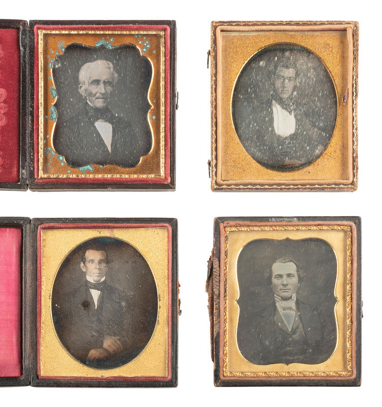 Head-on portrait of an elderly man looking directly at the camera. (Clouding, bit of tarnish, few spots to plate.) Housed under mat, glass, and preserver only. Mat stamped "REESE & CO. 289 BROADWAY." -- Seated portrait of a rather aged man seated next to a table surmounted by a thick volume or album. (Spotting throughout plate and mat.) Housed in a Union case. Etching to back of plate reads, "H L Stout / Fort Scott / Kans." Blue ink inscription to case interior reads, "My Grandfather / David Stout / Age about 80 / W. H. Stout." W. H. Stout likely refers to William Herr Stout (1837-1908), whose paternal grandfather was David Stout (1768-1858). -- And 23 others. Some without cases. Conditions vary. -- Together, 25 sixth plate daguerreotypes featuring men of varying ages.