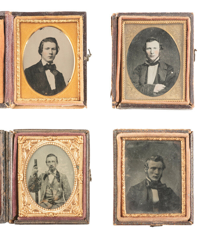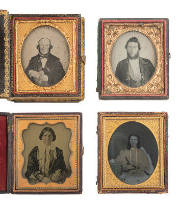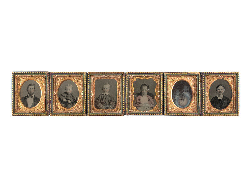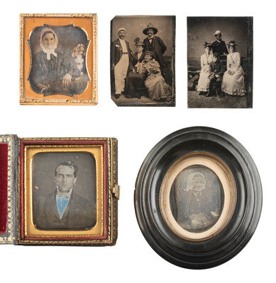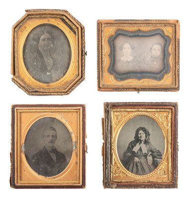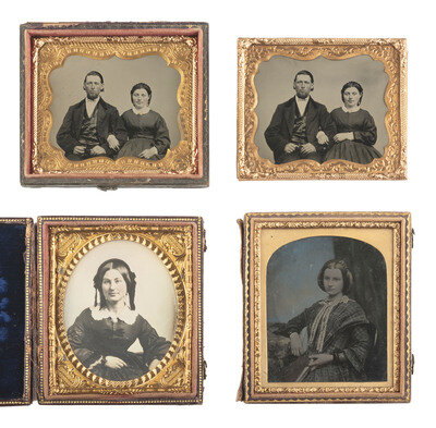 A lovely, crisp sixth plate daguerreotype portrait of a young lady wearing a brooch and beaded bracelet. (Very clear image, minor tarnishing to edge, spotting to mat.) Housed in a hand painted case (surface wear). -- A pair of landscape-oriented sixth plate tintypes of the same couple from the same sitting, almost identical except for a few minor differences in the pose. (Crisp images, minor imperfections.) Housed together, one on top of the other, in a half pressed paper case (surface wear/loss). -- European sixth plate seated portrait of a young lady holding her place in a red-tinted book with one finger and resting her arm on the table next to her. (Light imperfections.) Housed in a fully separated pressed paper case (surface wear). -- A folio-style case housing 6 tintype portraits featuring the members of a family including a man, a woman, and 5 children. -- And 17 others. Some loose, without any housings. Conditions vary. -- Together, 27 assorted daguerreotypes, ambrotypes, and tintypes.