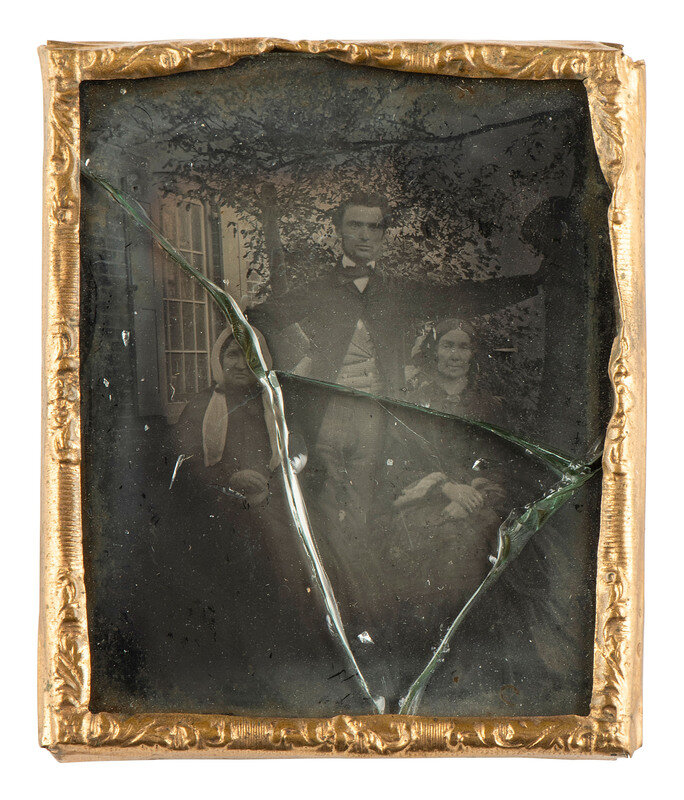 [With:] A ninth plate ambrotype portrait of three family members, broken into 4 pieces and loosely held together by a preserver.