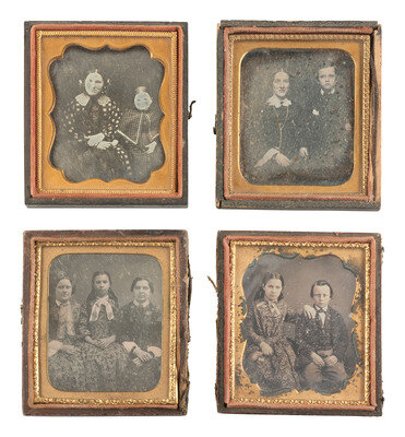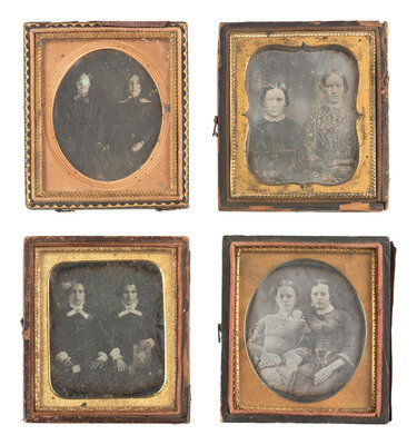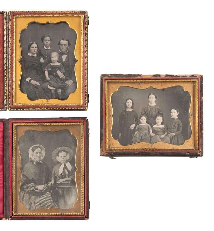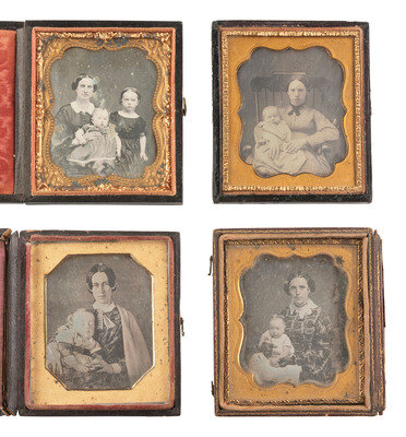 Highlights include: Quarter plate portrait of a group of 5 girls ranging in age from a toddler to a teenager, almost certainly sisters (very fine condition). Housed in pressed paper case (fully separated at hinge, surface wear throughout). -- Quarter plate portrait of a woman and child, presumably a mother and daughter, each wearing interesting hats. The young girl sits behind a desk with her hand resting on a book (overall very good clarity). Housed in leatherette case (some wear and areas of loss). -- Sixth plate portrait of a family of seven people seated and standing together within a small studio setting (light tarnish to edges). Housed in leatherette case (surface wear throughout). -- 4 sixth plate portraits of mothers posed with their infants, two of which appear to be sleeping peacefully (condition varies, with tarnish to edges and occasional spotting). Each housed in full or half case. -- Sixth plate portrait of a young man and two young women. The male subject appears to be holding flowers while one of the female subjects holds a book (tarnish to edges, spotting). Housed in half case (surface wear). -- 2 sixth plate portraits of mothers and their sons. In one portrait, both mother and son are smiling (very fine condition overall). In the other portrait, the mother is smiling (some cloudiness and wear to plate). Each housed in full or half case. -- And 15 others. Conditions vary. Some without cases. --Together, 25 daguerreotypes of varying sizes featuring families.
