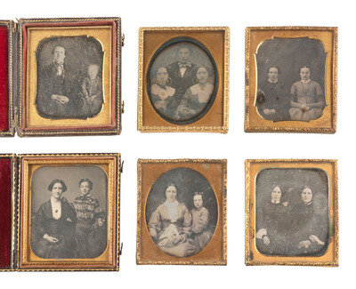 Lot comprised of 25 daguerreotypes featuring portraits of families or large groups, including parents with their children and siblings. Plate sizes include quarter plate (3) and sixth plate (22).