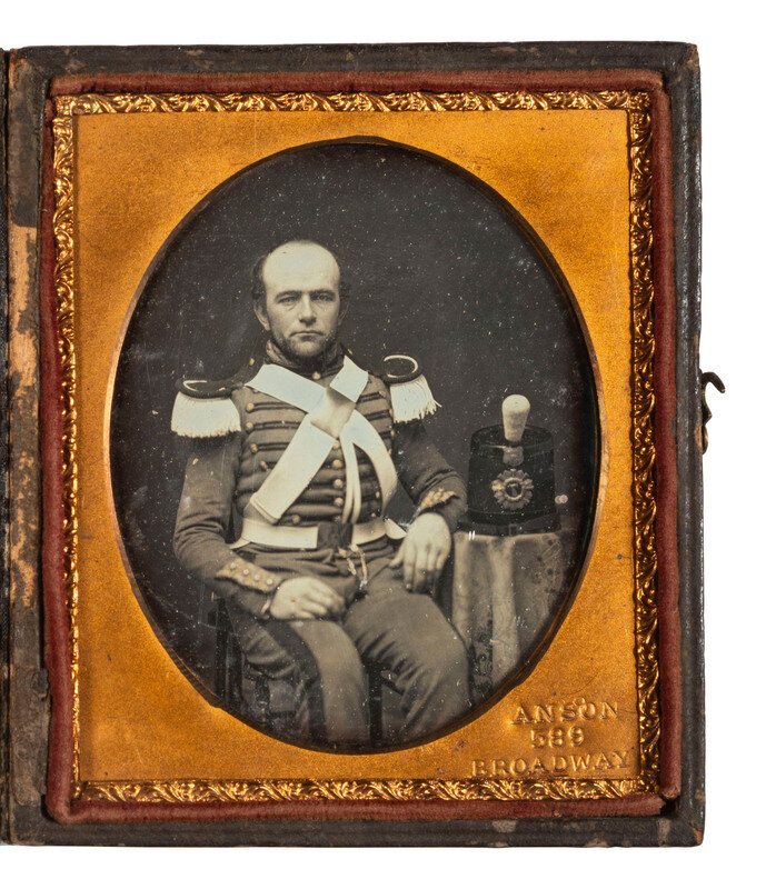 Fine seated portrait of a middle-aged militiaman wearing his coat, crossed chest straps, white belt, fringed epaulettes, and rectangular belt plate. His shako with encircled "7" rests on the table beside him. (Some tarnishing to edges, few small scratches, spots, and other imperfections to plate; unsealed.) Housed in a pressed paper case (general wear throughout, velvet image holders separated). Brass mat stamped, "ANSON / 589 / BROADWAY."