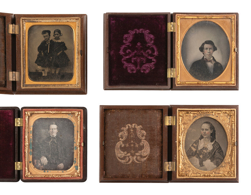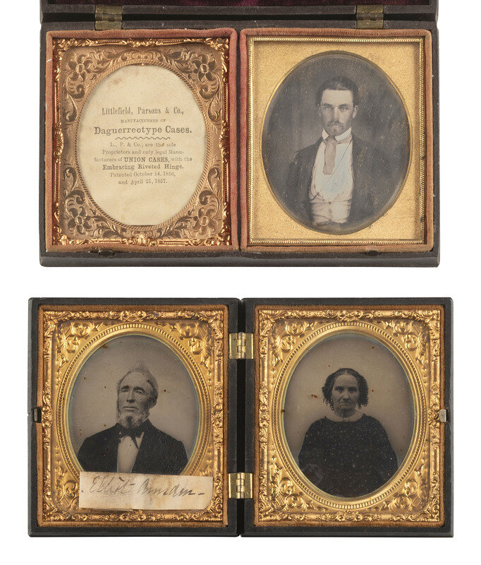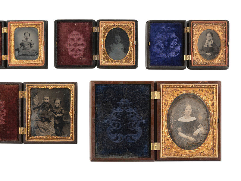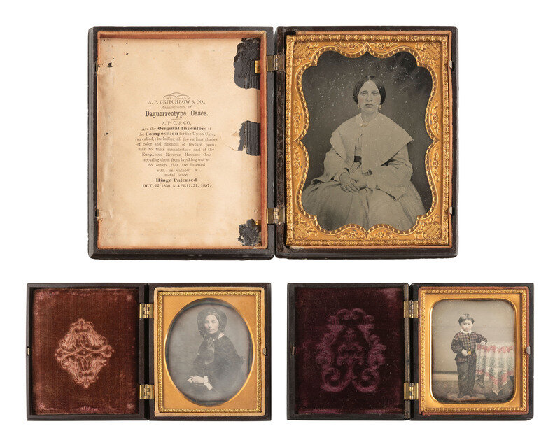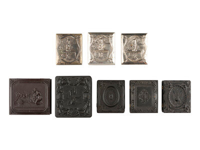 Including: Half plate figural example, American Country Life 2 [Berg 1-12] containing a tintype portrait of a woman (misalignment making opening case very difficult, heavy chipping, mottling to case surface). -- Double sixth plate figural example, Mother Embracing Child 2 [1-14] containing a daguerreotype portrait of a mustached man (soiling, nicking, loose closure to case). -- Quarter plate figural example, Capture of Major Andre [1-22] containing a daguerreotype portrait of a lovely woman (discoloration and loose closure to case). -- A sixth plate figural example, Rebekah at the Well [1-85] containing a daguerreotype portrait of an adorable young boy wearing a plaid belted jacket and standing next to a beautifully tinted clothed table (some repair to case). -- A sixth plate figural example, Hunter with Kill [1-94] containing a tintype portrait featuring two young children, one seated on the lap of the mother or a nanny, who is seated sideways and partly out of the scope of the lens (soiling, nicking, and loose closure to case). -- A sixth plate figural example, Lady with Falcon 2 [1-113] containing a daguerreotype portrait of a lovely woman wearing a hat with large ribbons and holding something indiscernible in her hand (light soiling and some nicking to case). -- And 15 others, including 7 sixth plate figural examples, 2 ninth plate figural examples, 4 ninth plate geometric/scroll examples, and 2 ninth plate all metal frame examples, The Garden Fountain [6-144] (one fully separated at spine with possible loss and possible unmatching sides. -- Together, 21 assorted Union cases. Some containing images. Conditions vary.
