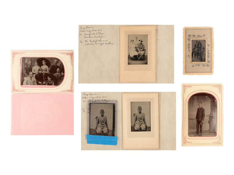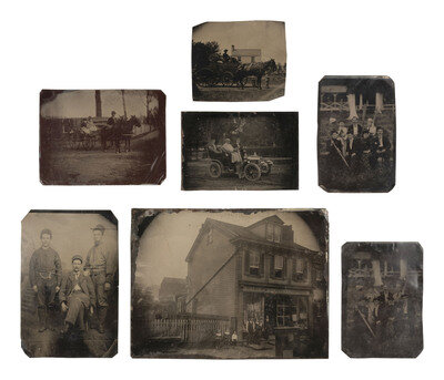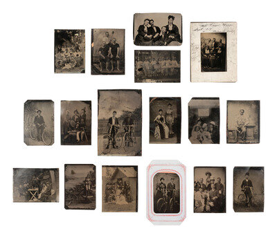 [EARLY PHOTOGRAPHY]. Large collection of assorted tintypes incl. large group portraits, bicyclists, & Edison Institute images.