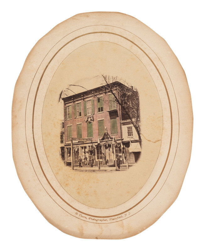 7 1/8 x 5 1/8 in. albumen photograph on 9 3/4 x 7 3/4 in. cardstock mount with photographer's imprint in lower margin, "G. Thorn, Photographer, Plainfield, N.J." The view captures six men standing in front of a building with a sign promoting "Ambrotypes & Photographs." Although the name of the studio is unclear, the photographer's imprint suggests that this may show Thorn's studio in Plainfield, NJ. The building appears to be draped in mourning, indicating that it may have been taking following the death of Abraham Lincoln.
