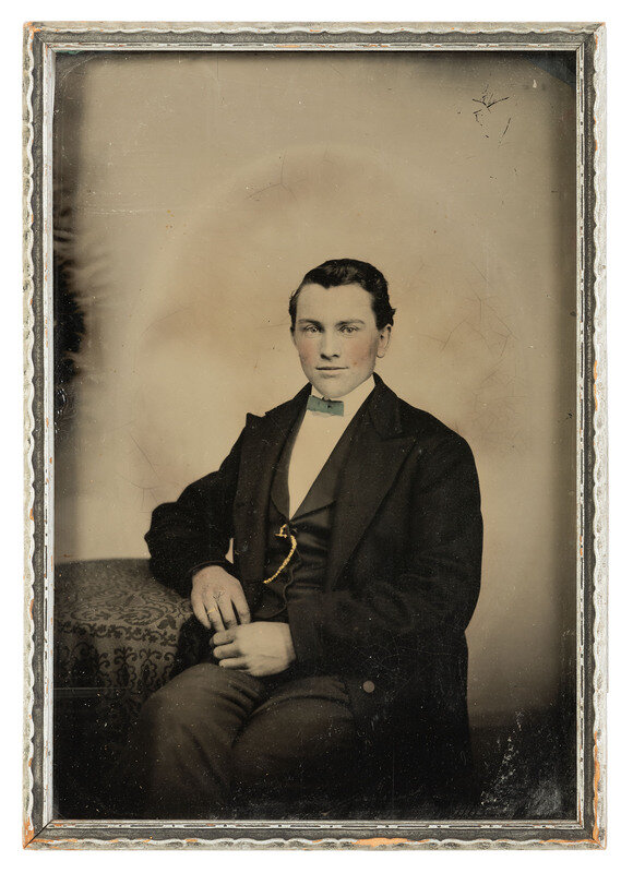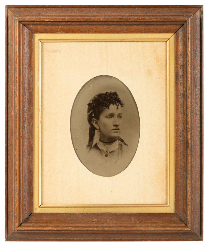 [With:] 6 3/4 x 9 3/4 in. (sight), crudely/loosely framed to 7 1/2 x 10 1/2 in., tintype portrait of a young man with gold-highlighted watch chain and ring. His bowtie is tinted blue. -- 4 1/2 6 1/2 in. (sight), matted and framed to 12 1/2 x 15 in., vignetted tintype portrait of a young woman wearing a lace collar and curled locks. -- Together, 2 framed tintypes. Conditions of images and frames vary.