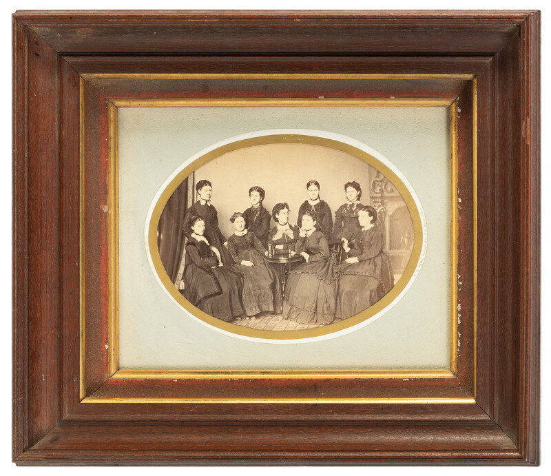 7 1/4 x 5 1/4 in. (sight), matted and framed to 15 x 13 in., oval albumen portrait of a group of 9 adult women standing and seated in a studio. One woman holds a book upright on a round table placed at the center of the group. Credited in print just outside of gilt edge. (Image not examined out of the frame; frame with some damage, back with losses and some separation).