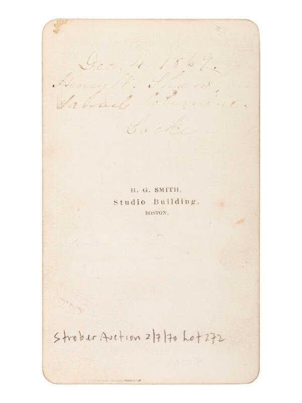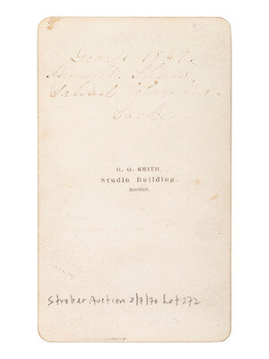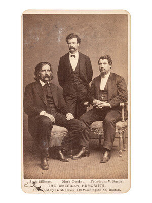 CDV portrait of The American Humorists, from left to right: Josh BILLINGS (Henry Wheeler Shaw), Mark TWAIN (Samuel Clemens), and Petroleum V. NASBY (David Ross Locke) (rich tonality, some wear and stray marks). Boston: H. G. Smith, ca 1869. Verso bears photographer's imprint along with ink inscription reading, "Dec. 4 1869. Henry W. Shaw, Samuel Clemens, Locke."