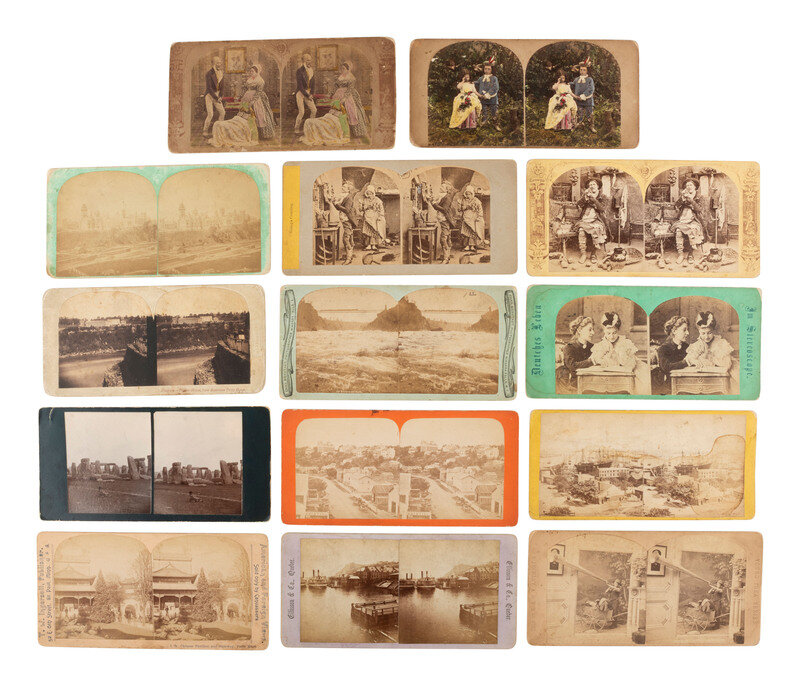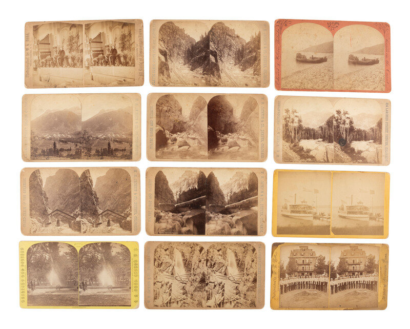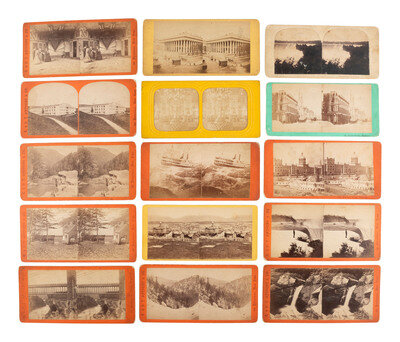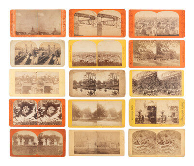 72 assorted stereoviews featuring a variety of scenes and subjects including: Baltimore Harbor from Federal Hill, Looking S. E. (Anthony). -- Steamers in Montreal. (Ellisson & Co.) -- Chinese Pavilion and Gateway, Paris Expo. (T. W. Ingersoll). -- Stone Henge. (F. Pearse). -- Niagara. — Clifton House, from American Ferry House. (Langenheim). -- Niagara in Winter. General view of the Falls from Point View. (Anthony). -- Niagara Suspension Bridge. (Langenheim). -- Prof. King's Mammouth [sic] Baloon [sic] 'Buffalo' ascension at Buffalo, Sept. 16th. 1873. (C. L. Pond). -- The Fallen Monarch, Mariposa Grove, Cal. (Bierstadt). -- Deer Hunting. (Kilburn Brothers). -- Toltec Gorge and Vicinity. (W. H. Jackson). -- Grand Canyon of the Arkansas. (W. H. Jackson). -- And many others, including views from abroad. -- Together, 72 stereoviews of assorted scenes and subjects.